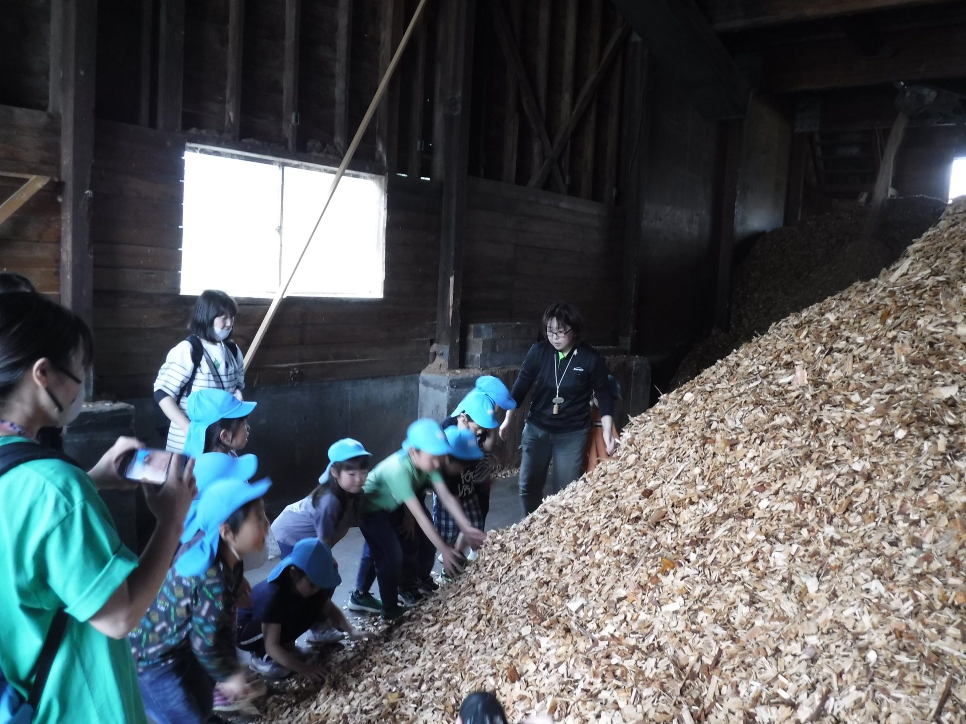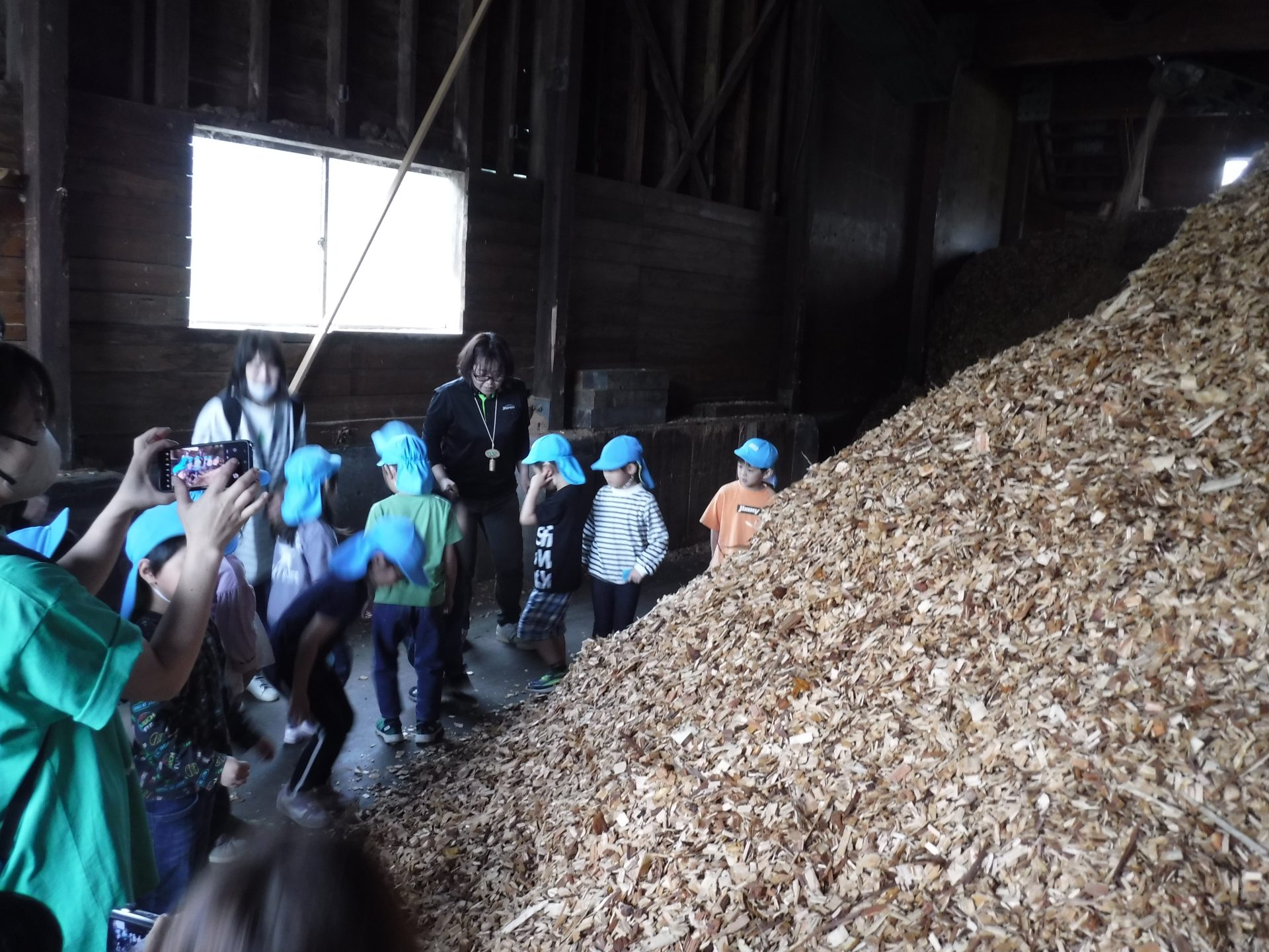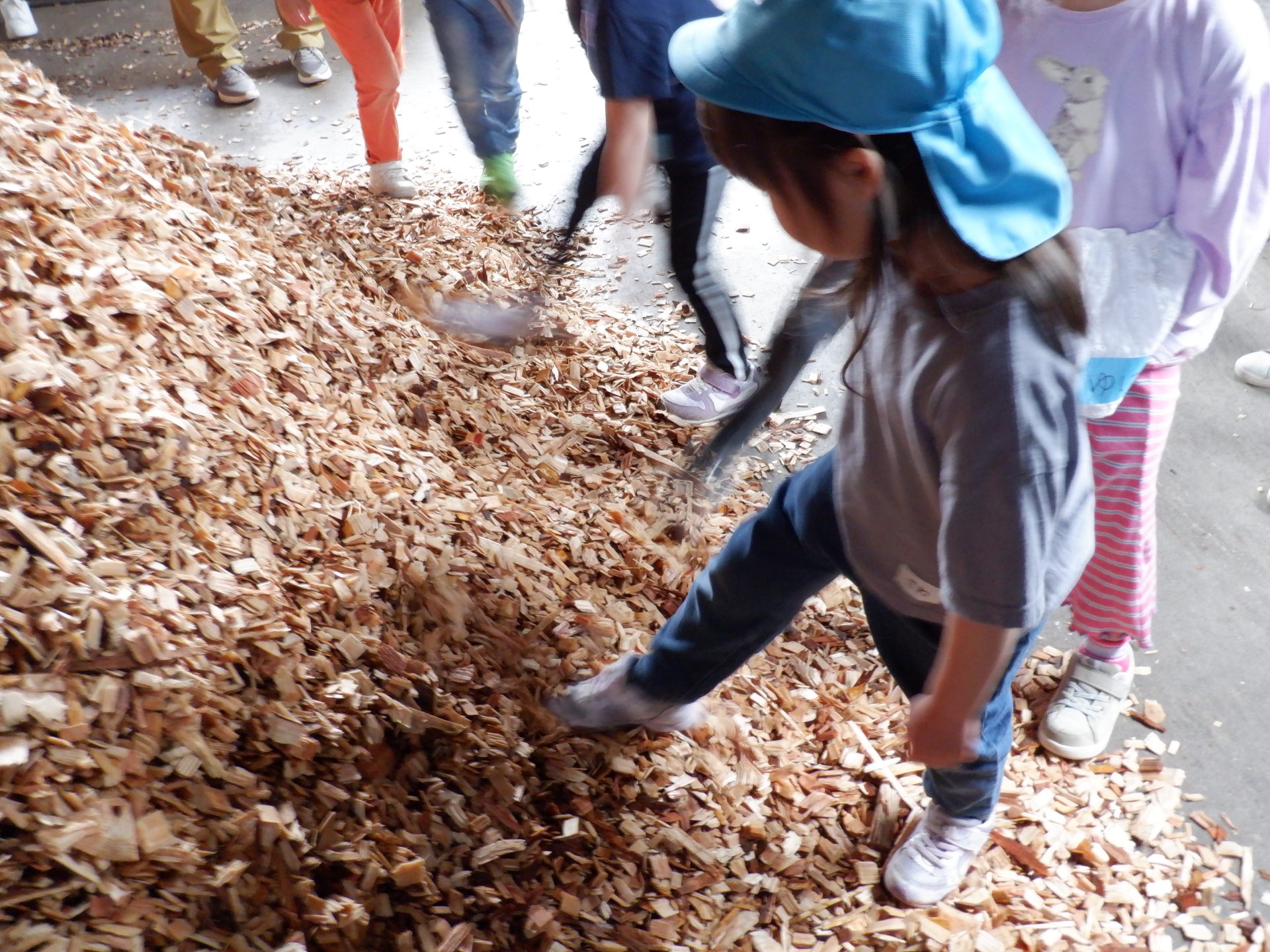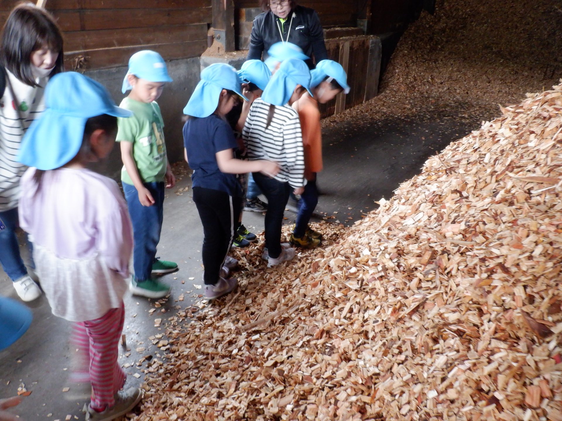 ここは、同じ木なのに、さっきまでとちょっと違うにおいがしました。固い地面に木くずを敷いて歩くと、柔らかく、ふわふわしました。高く積み重なった山を登ろうとしますが、柔らかくて、足が埋もれ、崩れてきて、大変でした。木くずは、週に3回ほど、大きなトラックに積まれ、出荷されるそうです。そして、燃やされ、エネルギーになることも教えてもらいました!