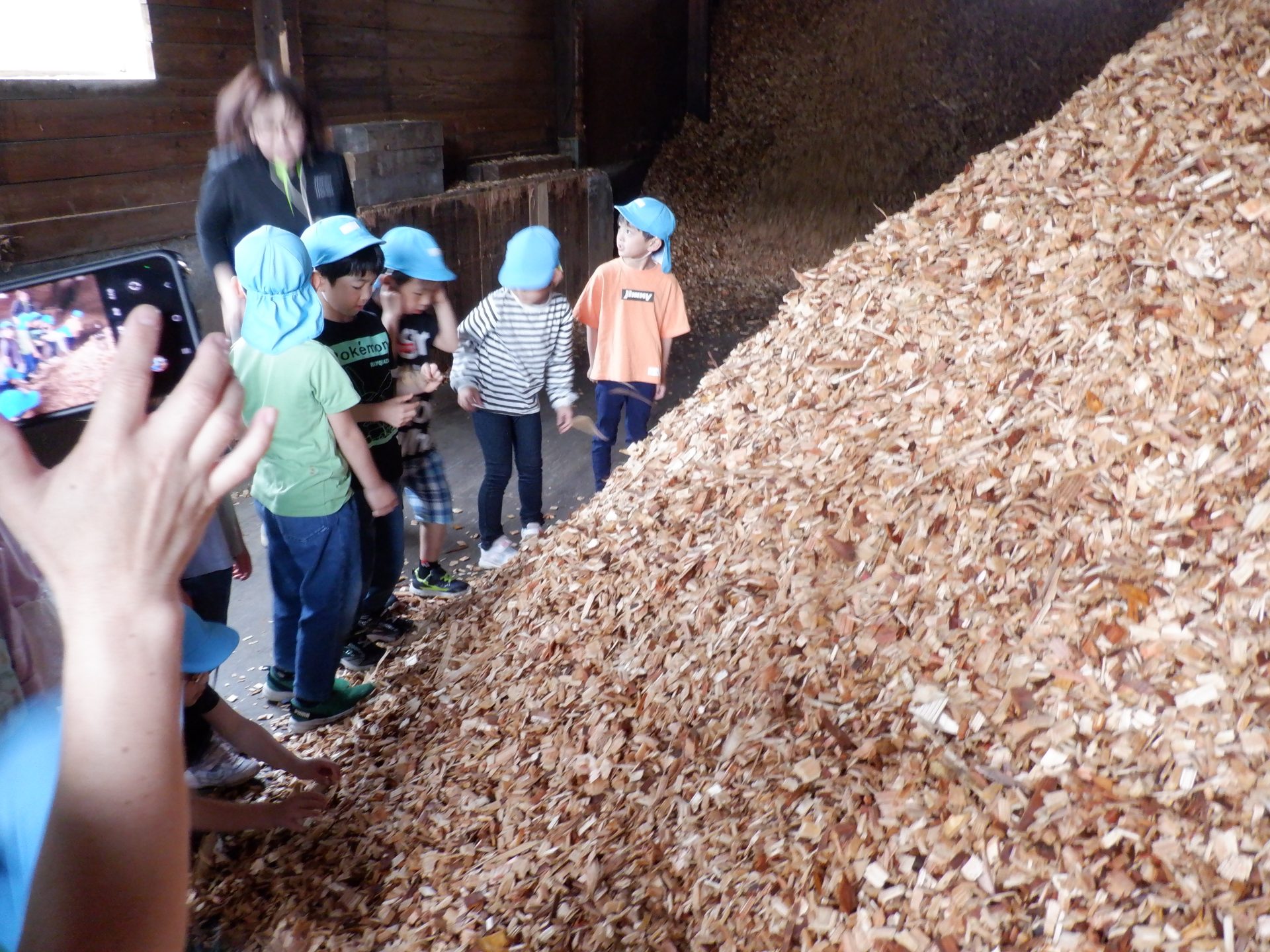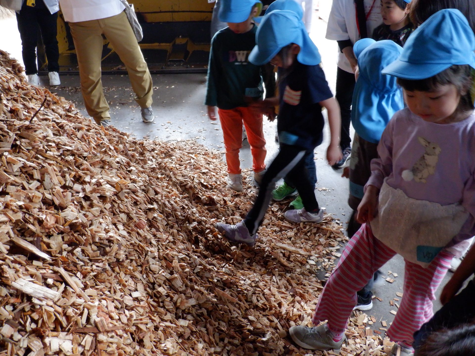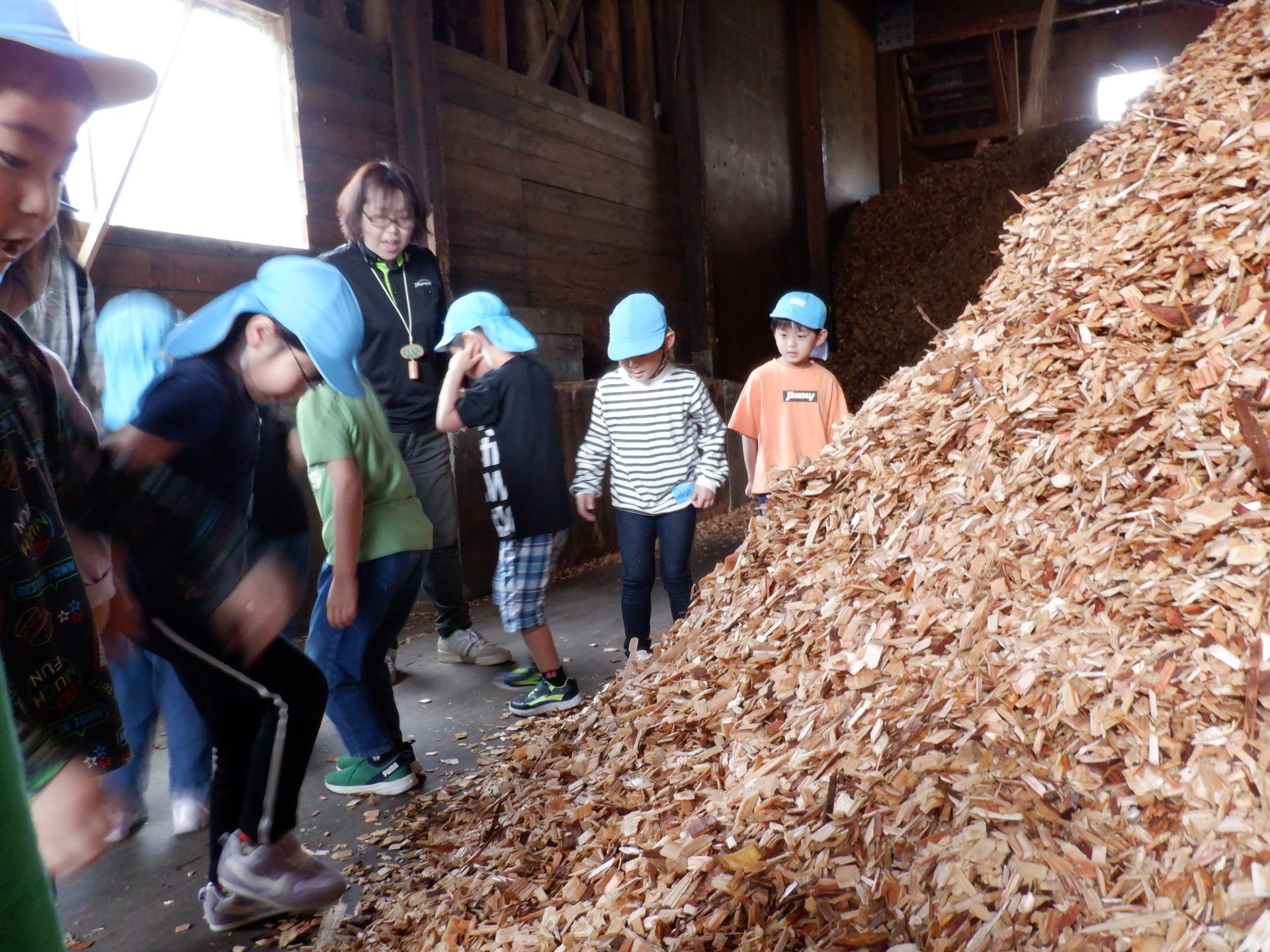 ここは、同じ木なのに、さっきまでとちょっと違うにおいがしました。固い地面に木くずを敷いて歩くと、柔らかく、ふわふわしました。高く積み重なった山を登ろうとしますが、柔らかくて、足が埋もれ、崩れてきて、大変でした。木くずは、週に3回ほど、大きなトラックに積まれ、出荷されるそうです。そして、燃やされ、エネルギーになることも教えてもらいました!