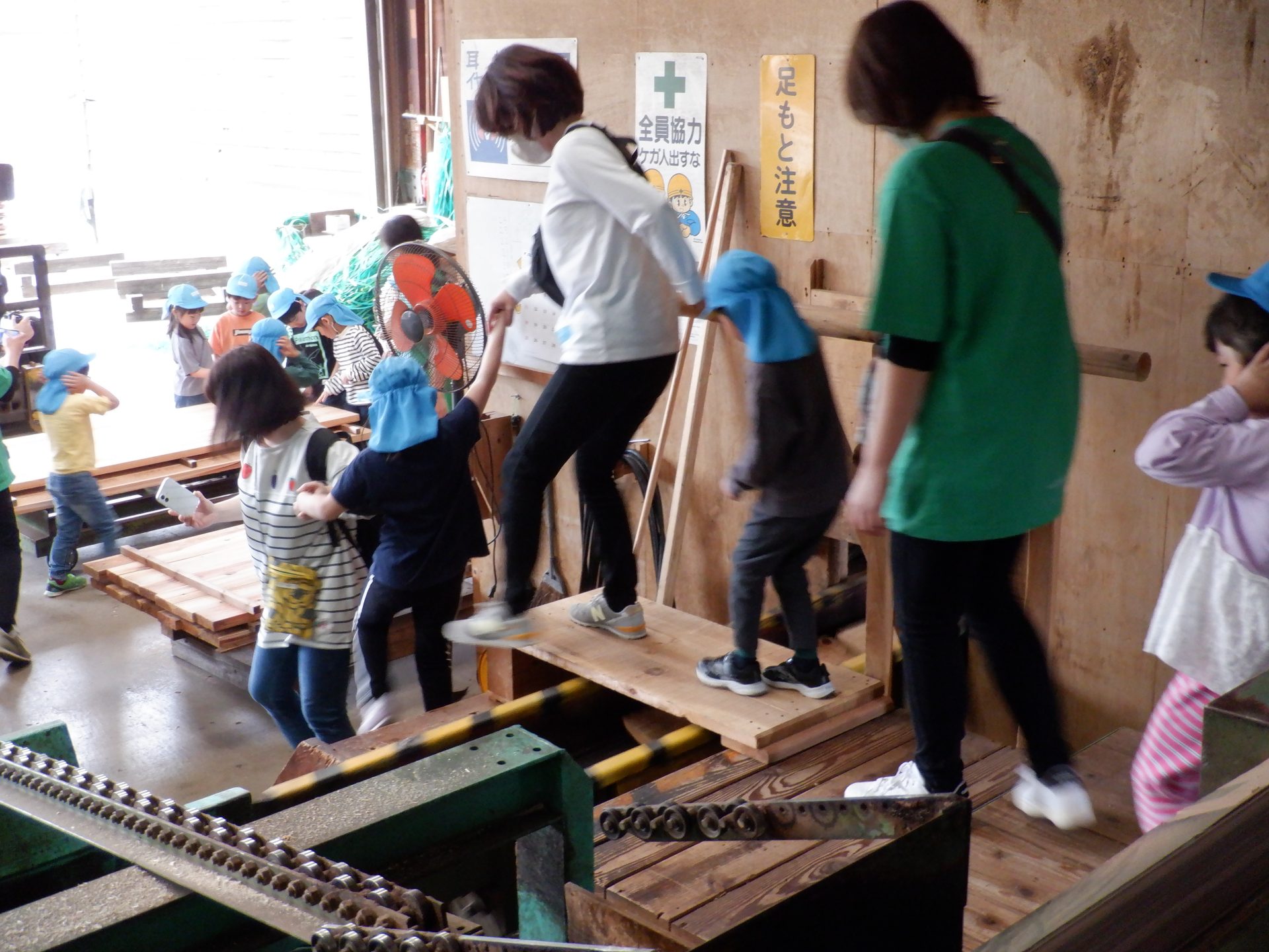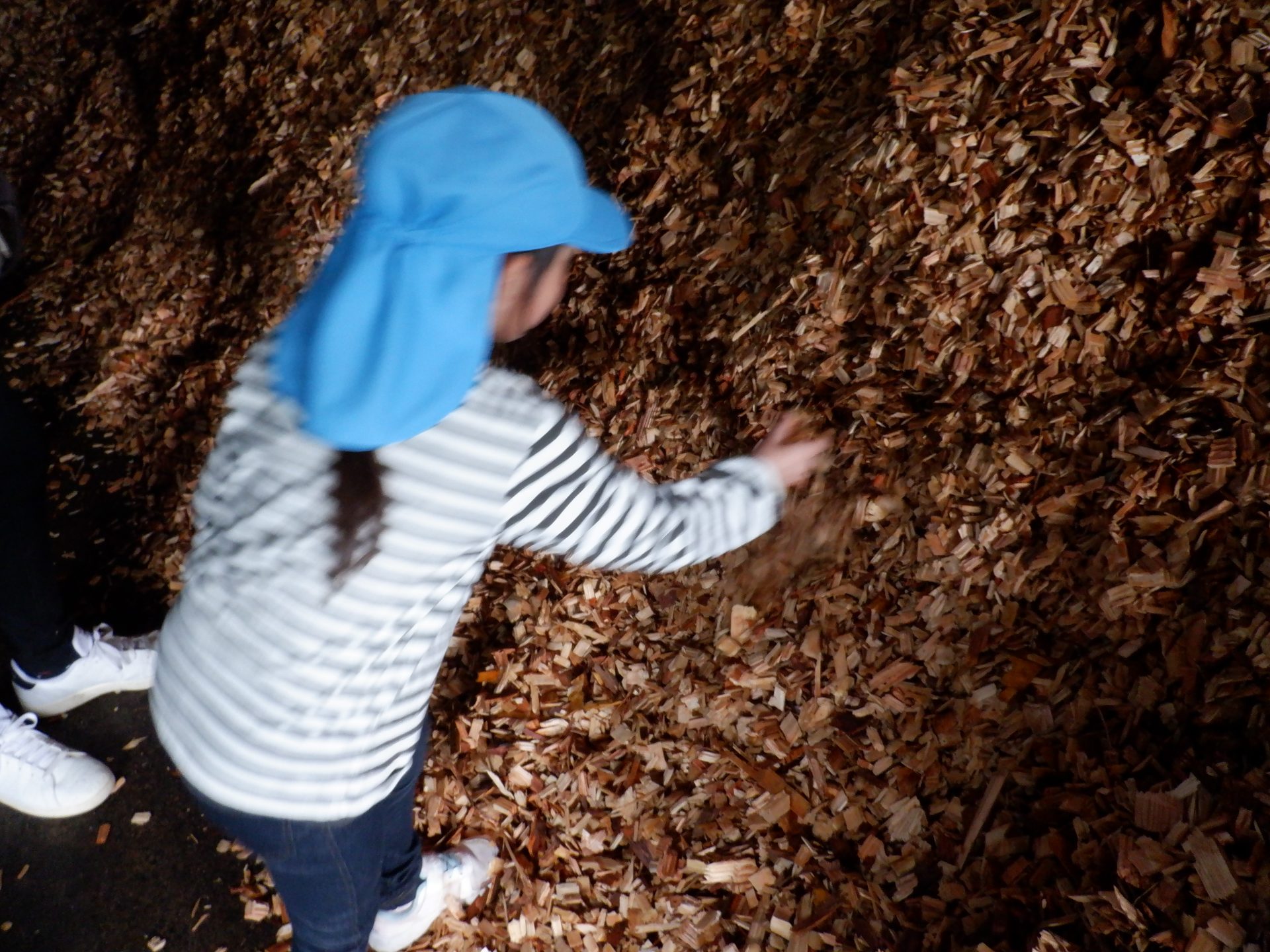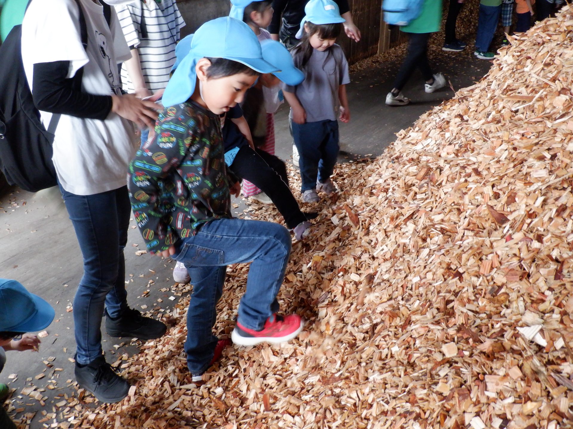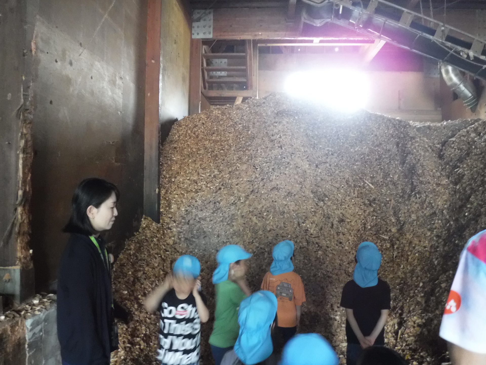 ここは、同じ木なのに、さっきまでとちょっと違うにおいがしました。固い地面に木くずを敷いて歩くと、柔らかく、ふわふわしました。高く積み重なった山を登ろうとしますが、柔らかくて、足が埋もれ、崩れてきて、大変でした。木くずは、週に3回ほど、大きなトラックに積まれ、出荷されるそうです。そして、燃やされ、エネルギーになることも教えてもらいました!