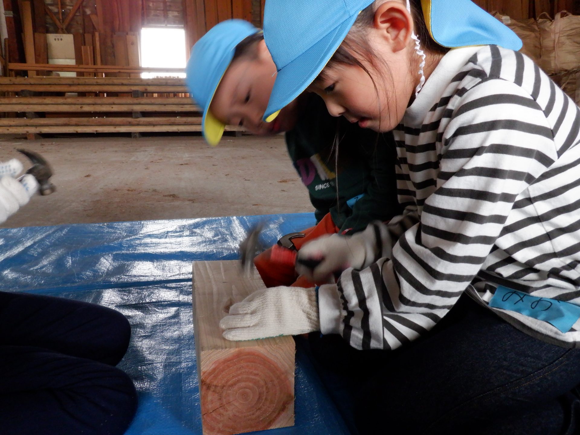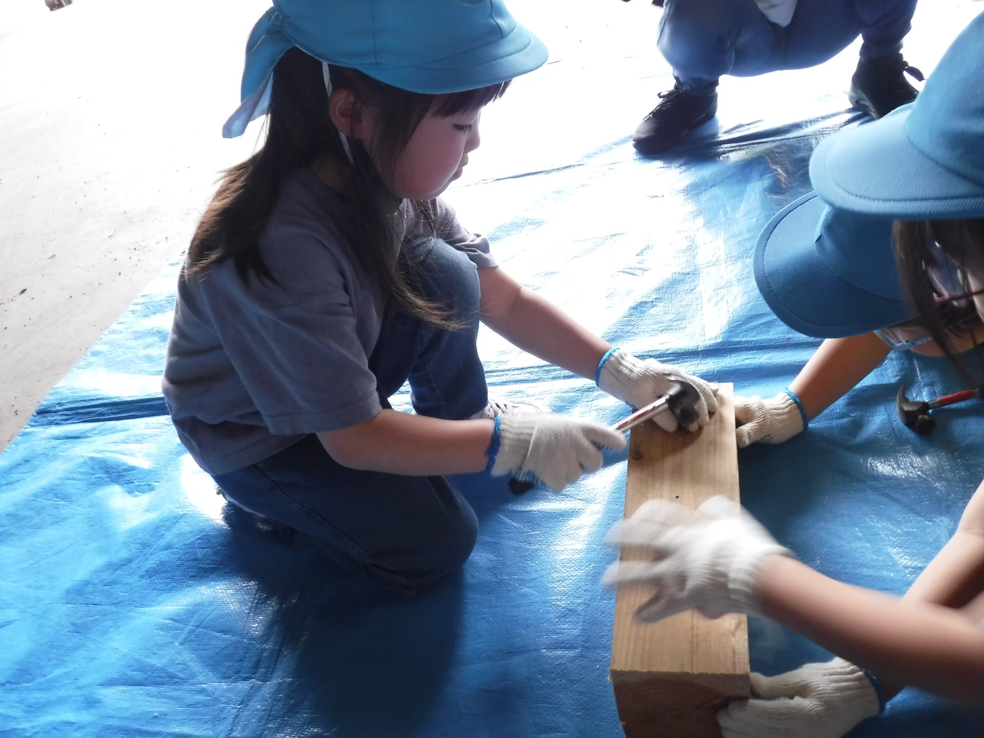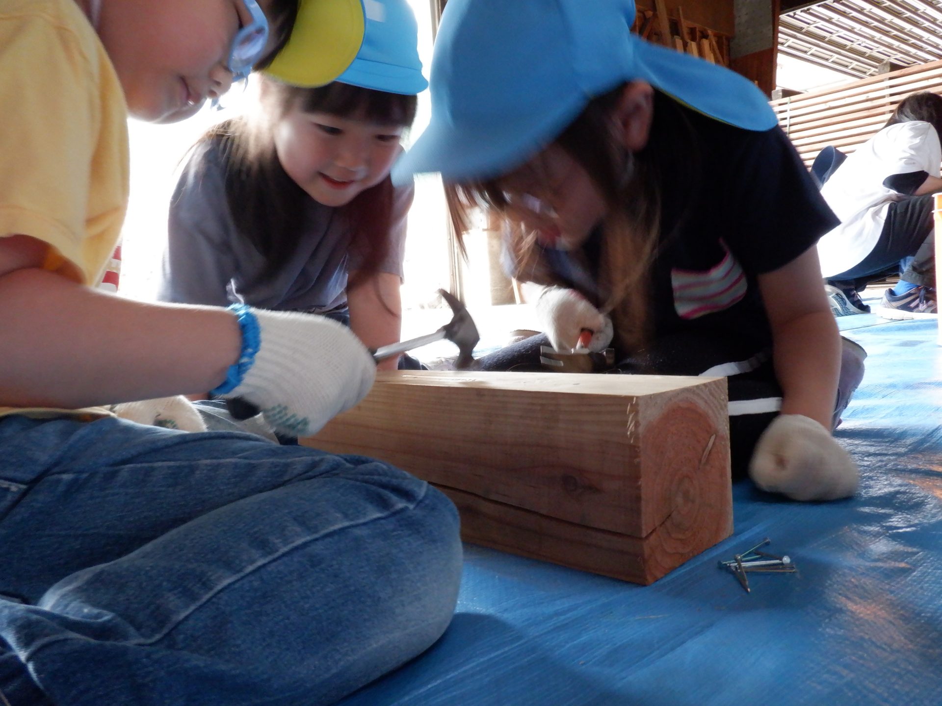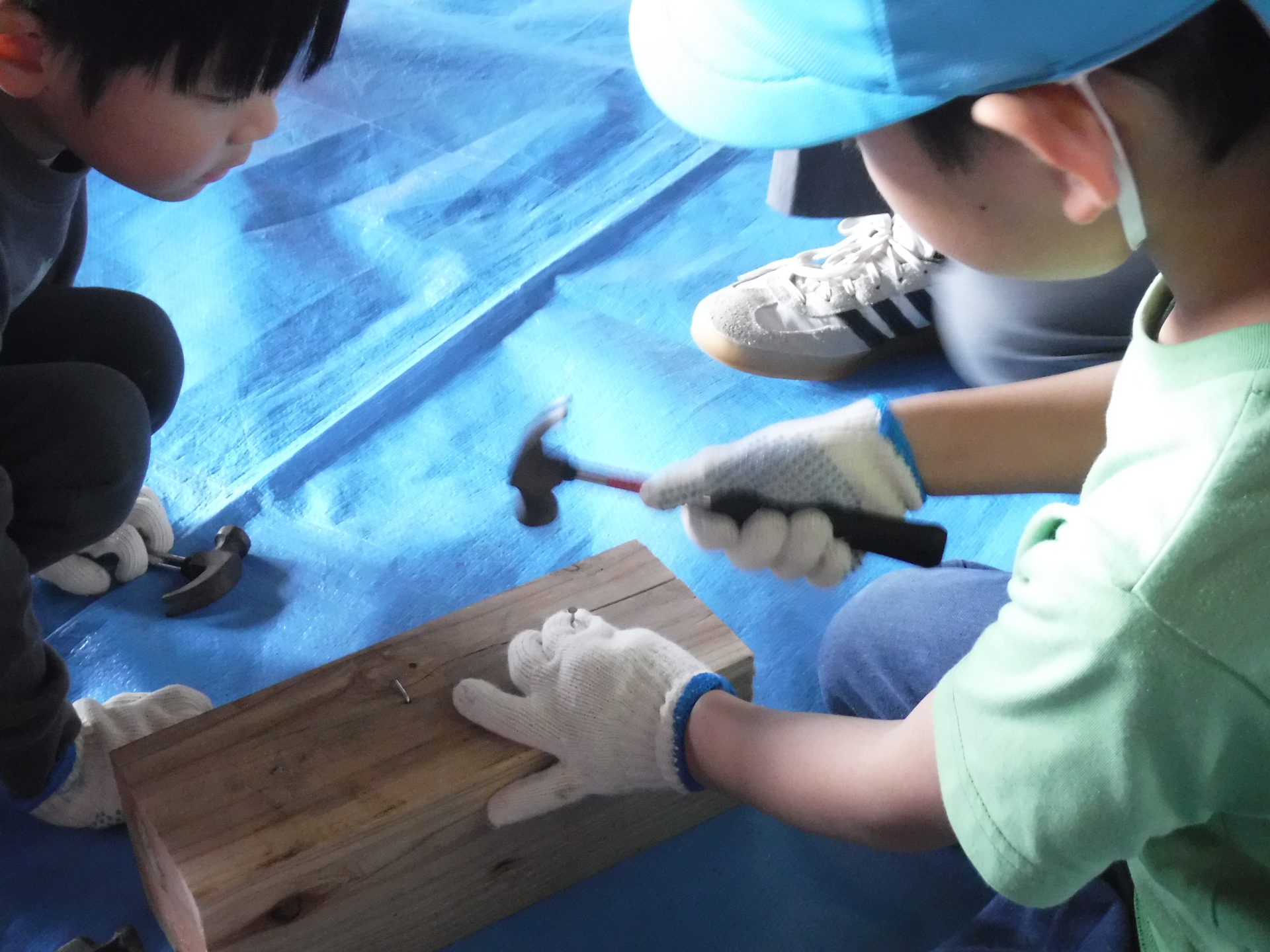 木をおさえて、お友だちの釘打ちのお手伝いをしたり、上手に打てたら、一緒に喜んだり、応援したりと、釘を打つ音と、子どもたちの素敵な声が響いた時間になりました。