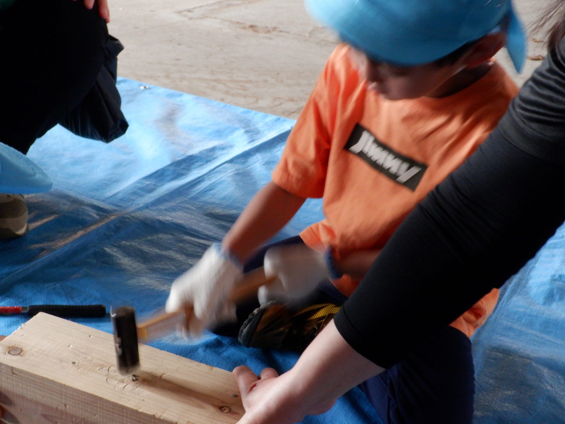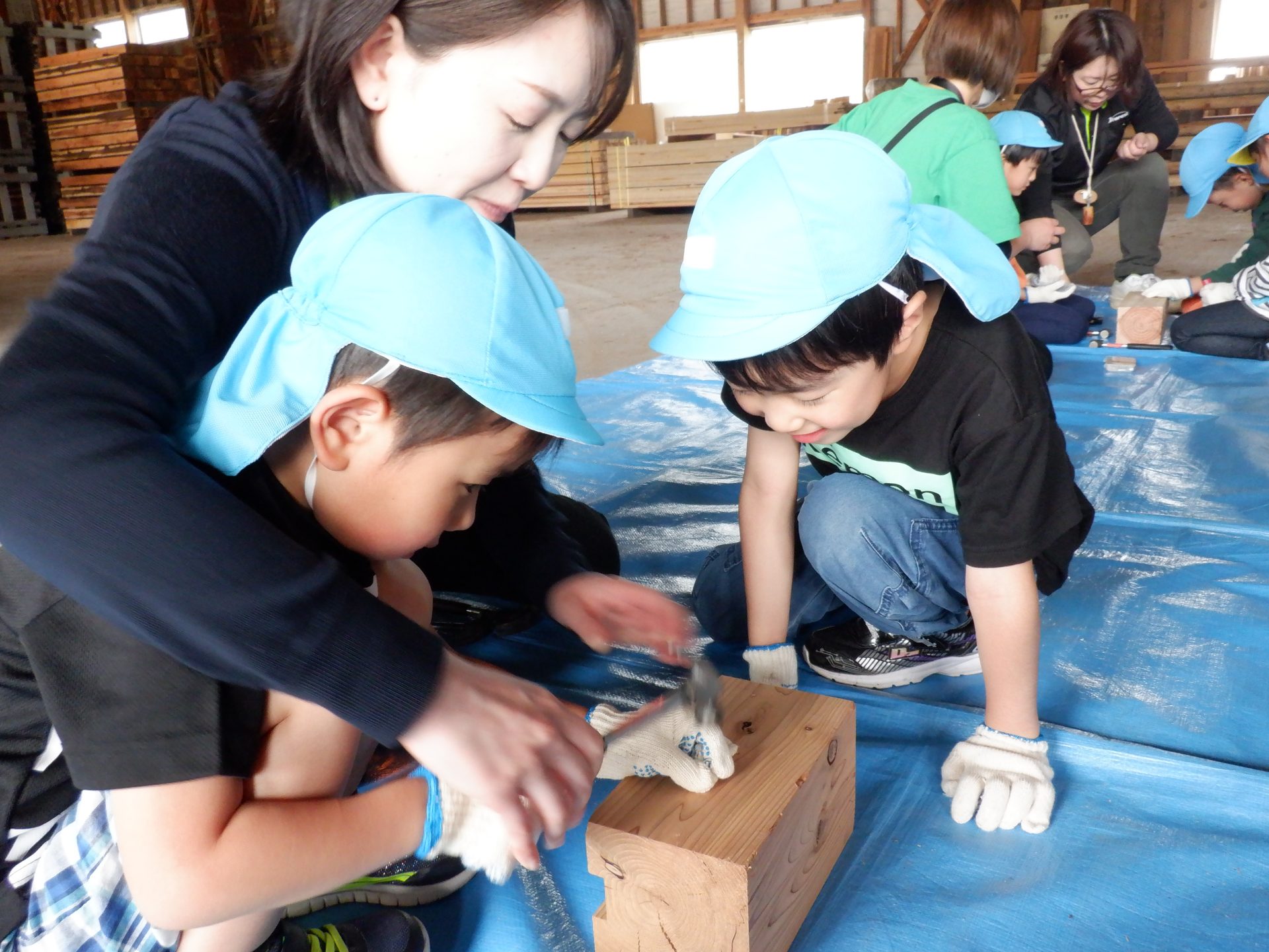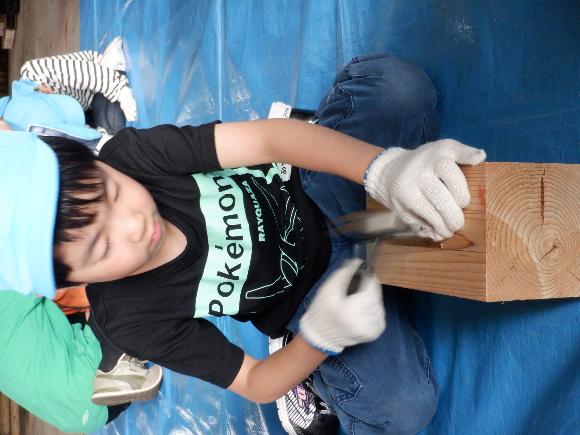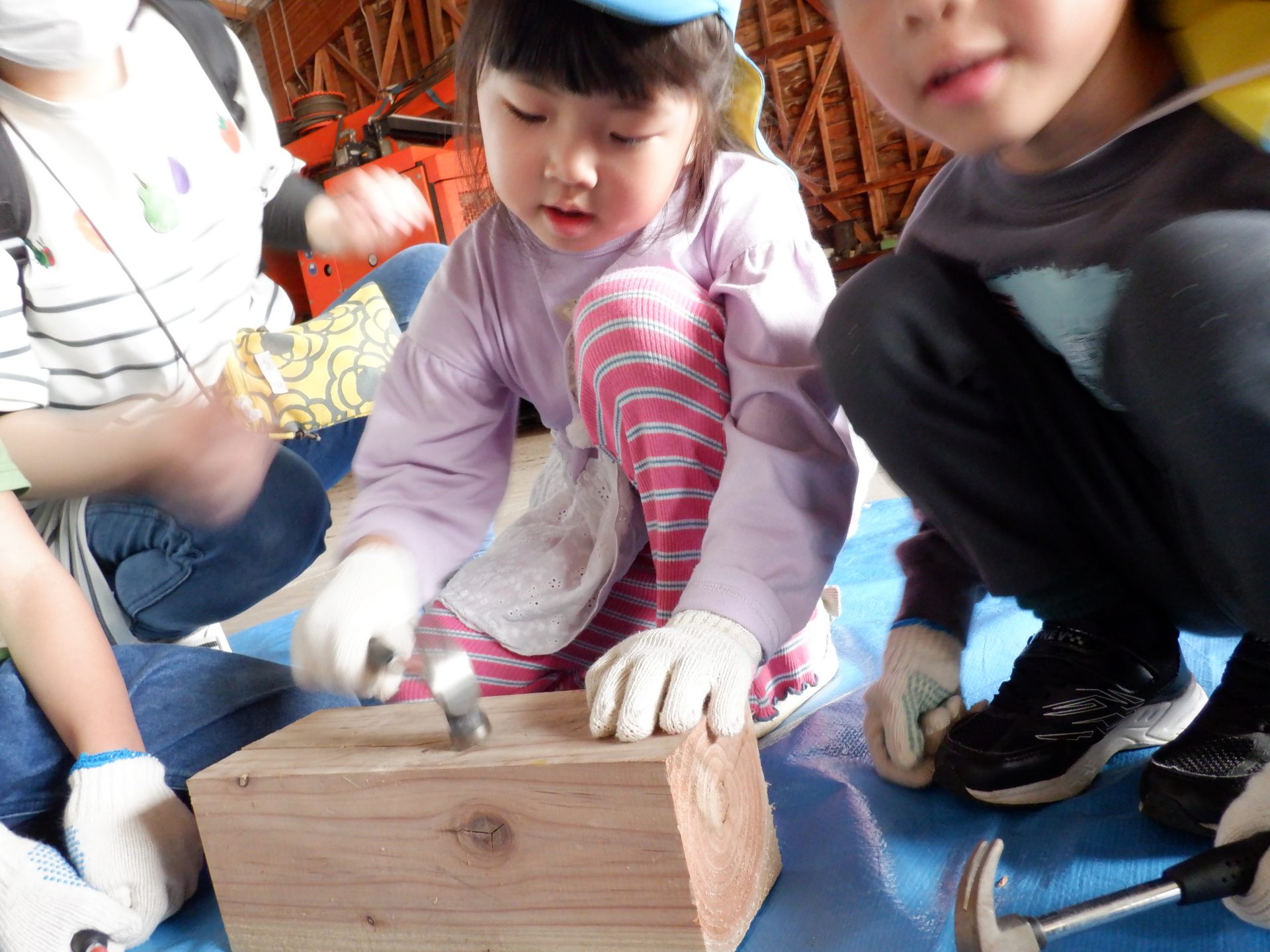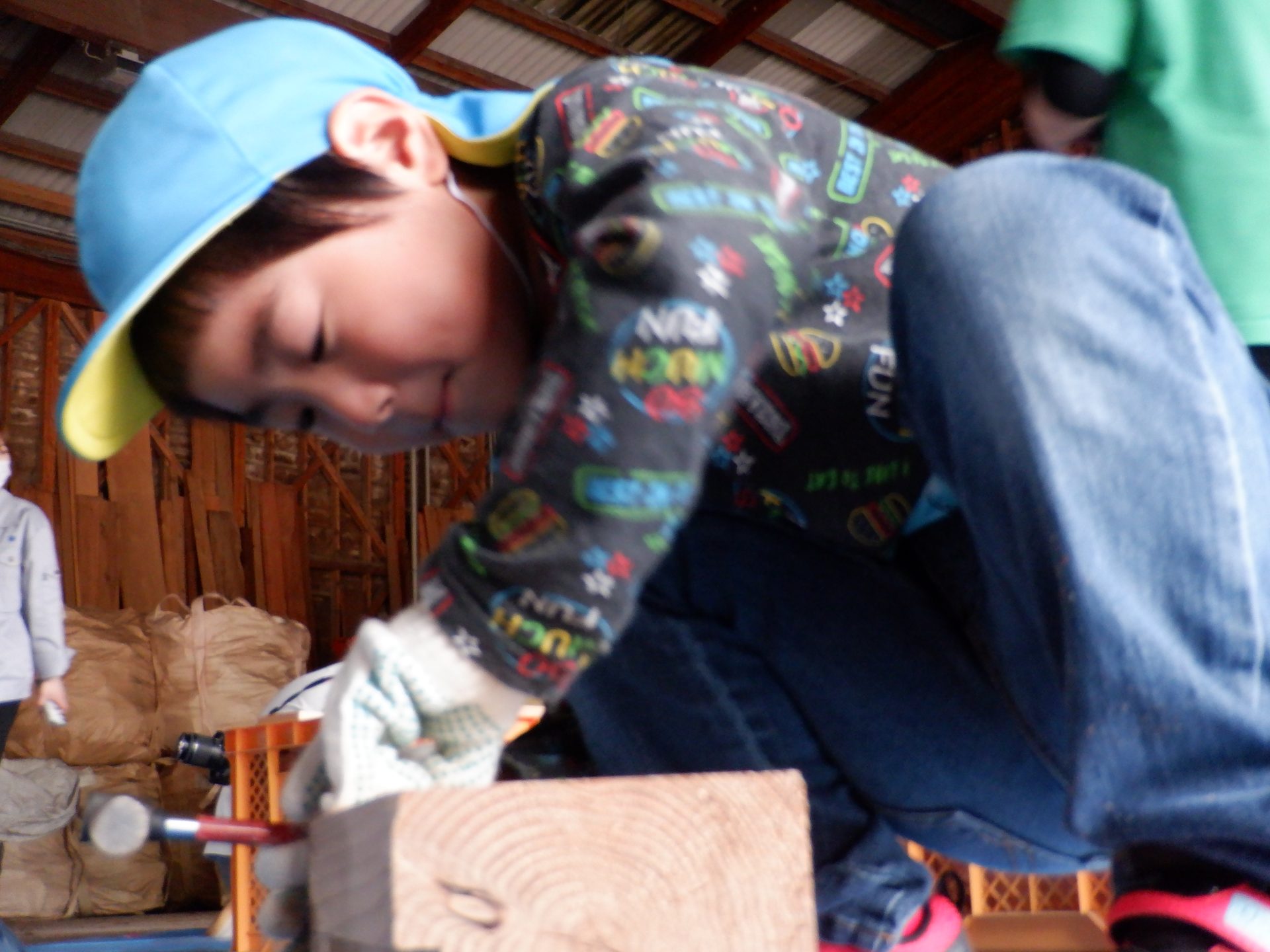 木をおさえて、お友だちの釘打ちのお手伝いをしたり、上手に打てたら、一緒に喜んだり、応援したりと、釘を打つ音と、子どもたちの素敵な声が響いた時間になりました。
