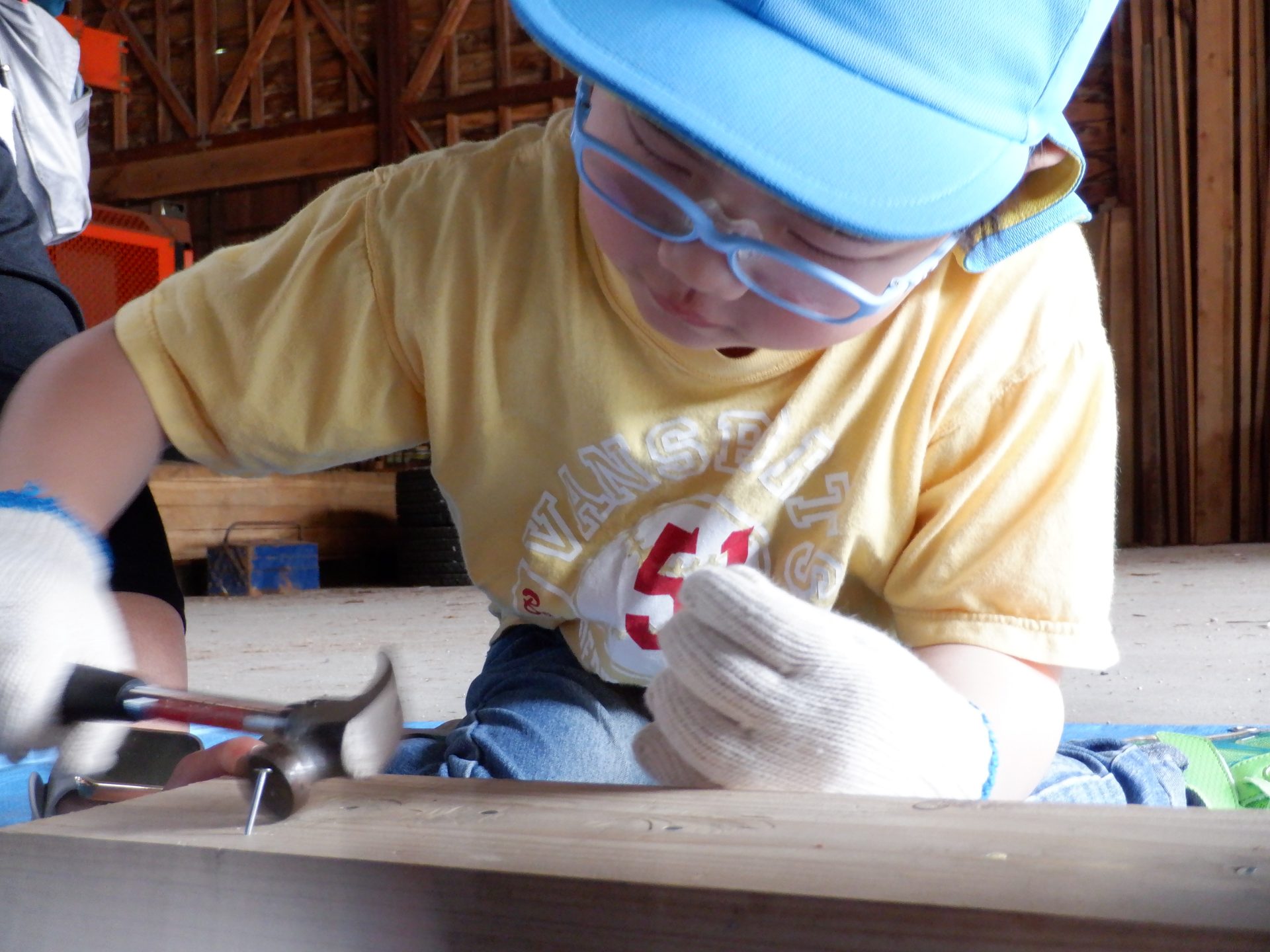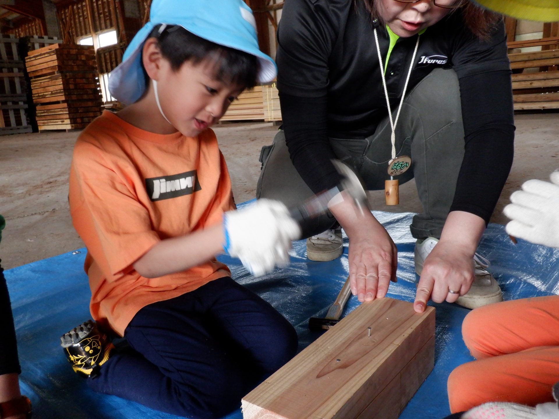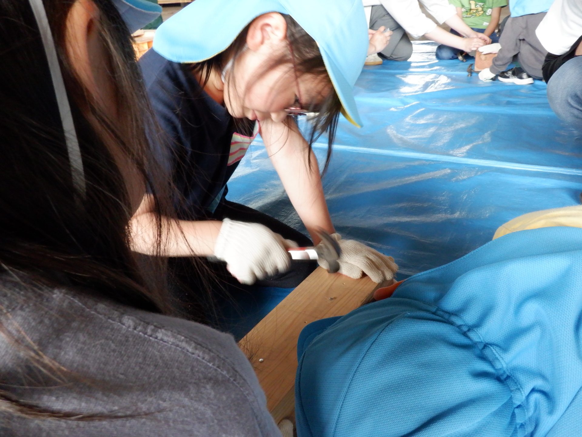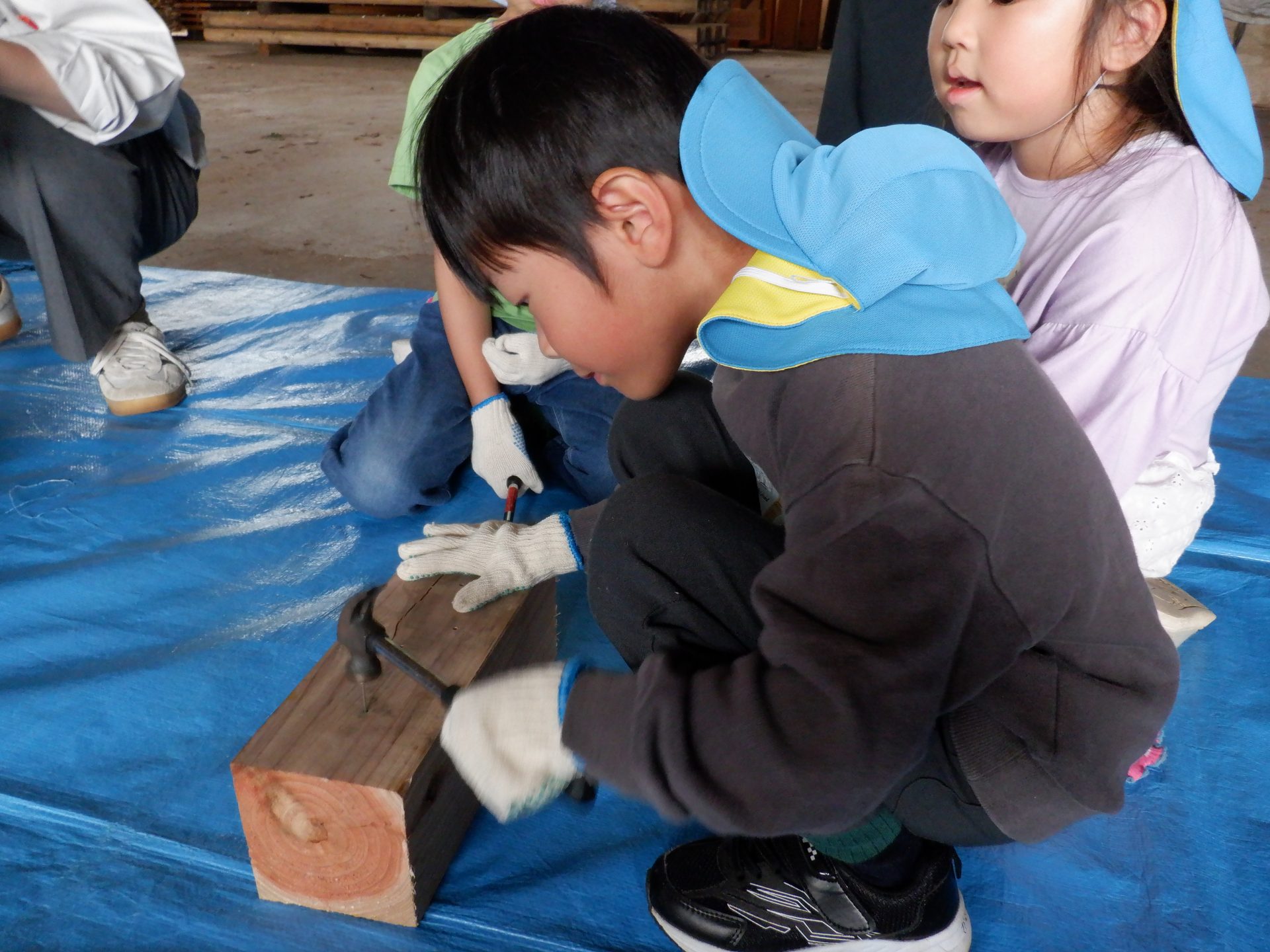 木をおさえて、お友だちの釘打ちのお手伝いをしたり、上手に打てたら、一緒に喜んだり、応援したりと、釘を打つ音と、子どもたちの素敵な声が響いた時間になりました。