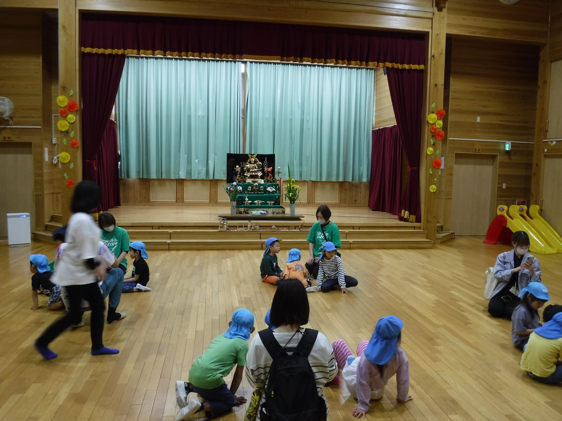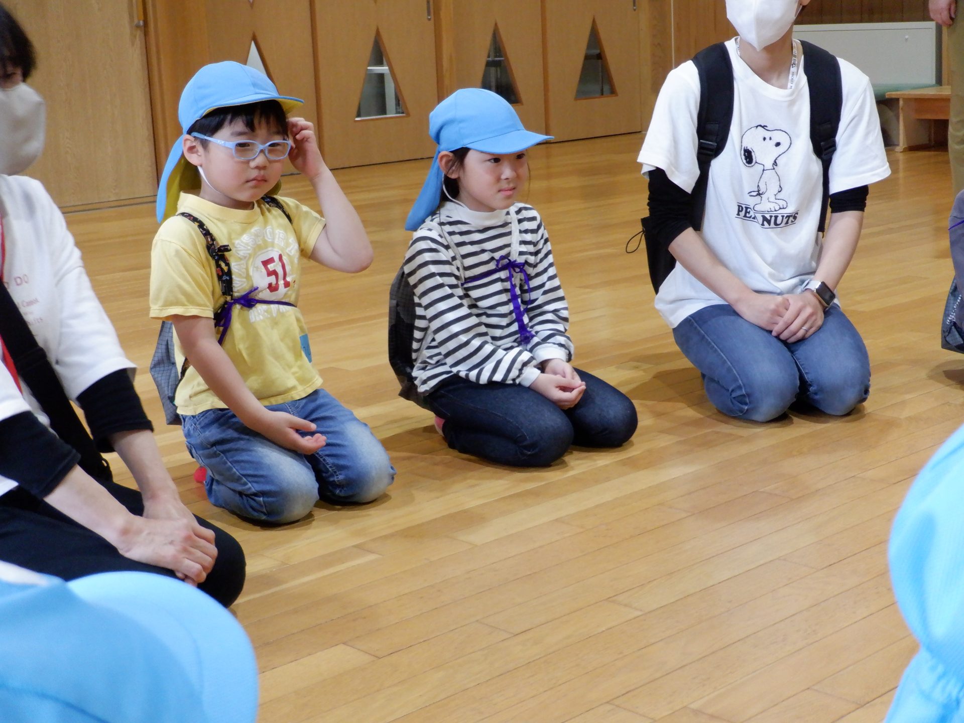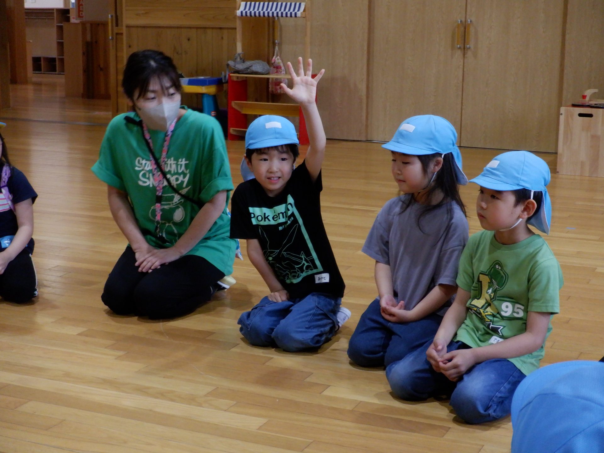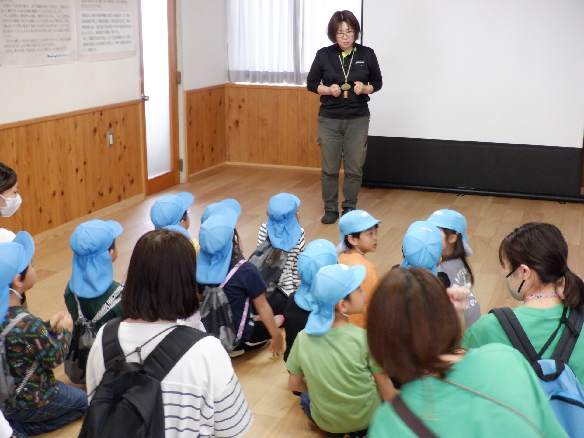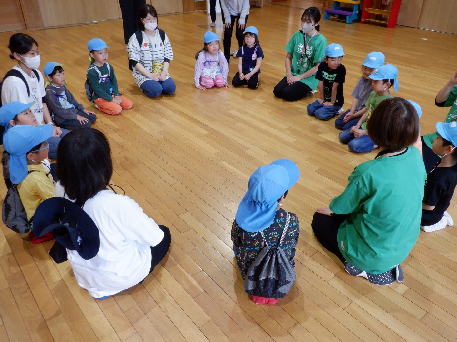 9時15分。あつみ保育園に、鼠ヶ関保育園の年長児が来園です。「おはようございます!」と、元気な声が響きます。初めて会う2園の年長児。どちらも、なんだかドキドキが、聞こえてきそうな緊張した表情です。まずは、始まりの会。みんなで、丸くなって座ります。まずは、自己紹介。自分の名前を言ったら、次のお友だちにタッチをして、つなぎます。自己紹介が終わったら、今日の活動の説明です。あつみ保育園では、森林組合の方から、あつみ杉のお話はしてもらいましたが、森林組合見学は初!!鼠ヶ関保育園の年長さんと同じくらい、楽しみにしてきました。初めてのお友だちとの出会いのドキドキと、これから体験することへの楽しみのドキドキを胸に、いざ出発です‼