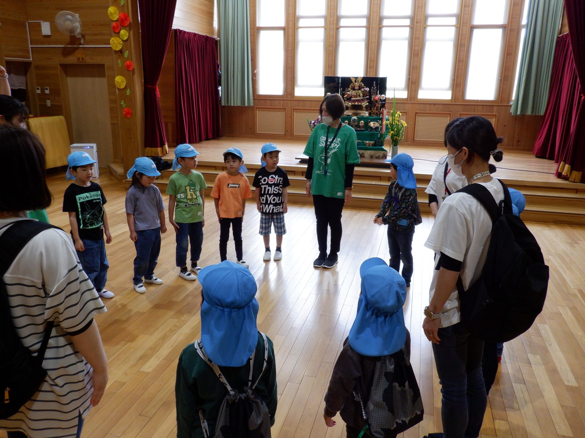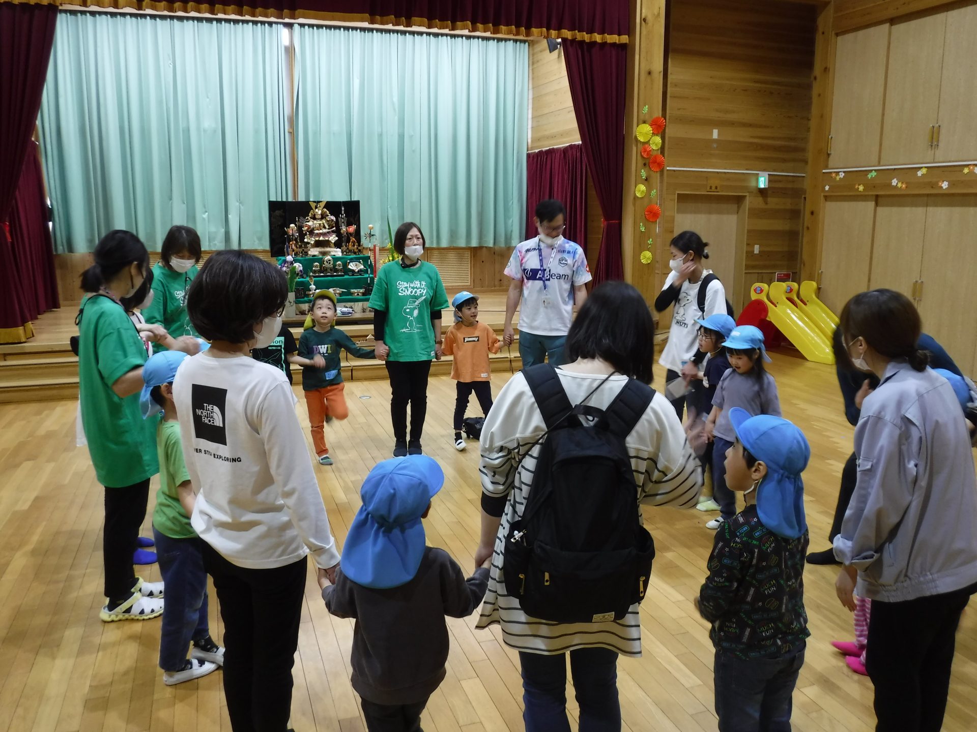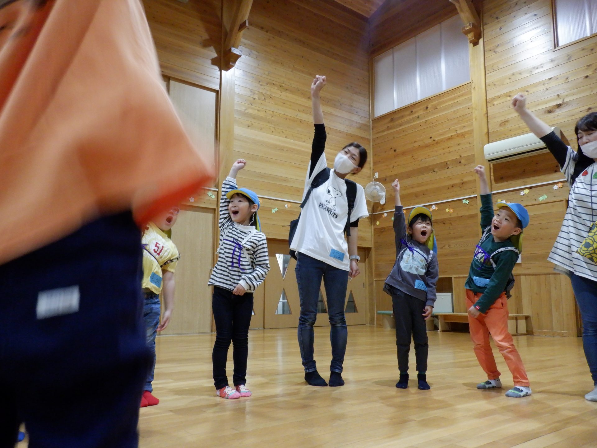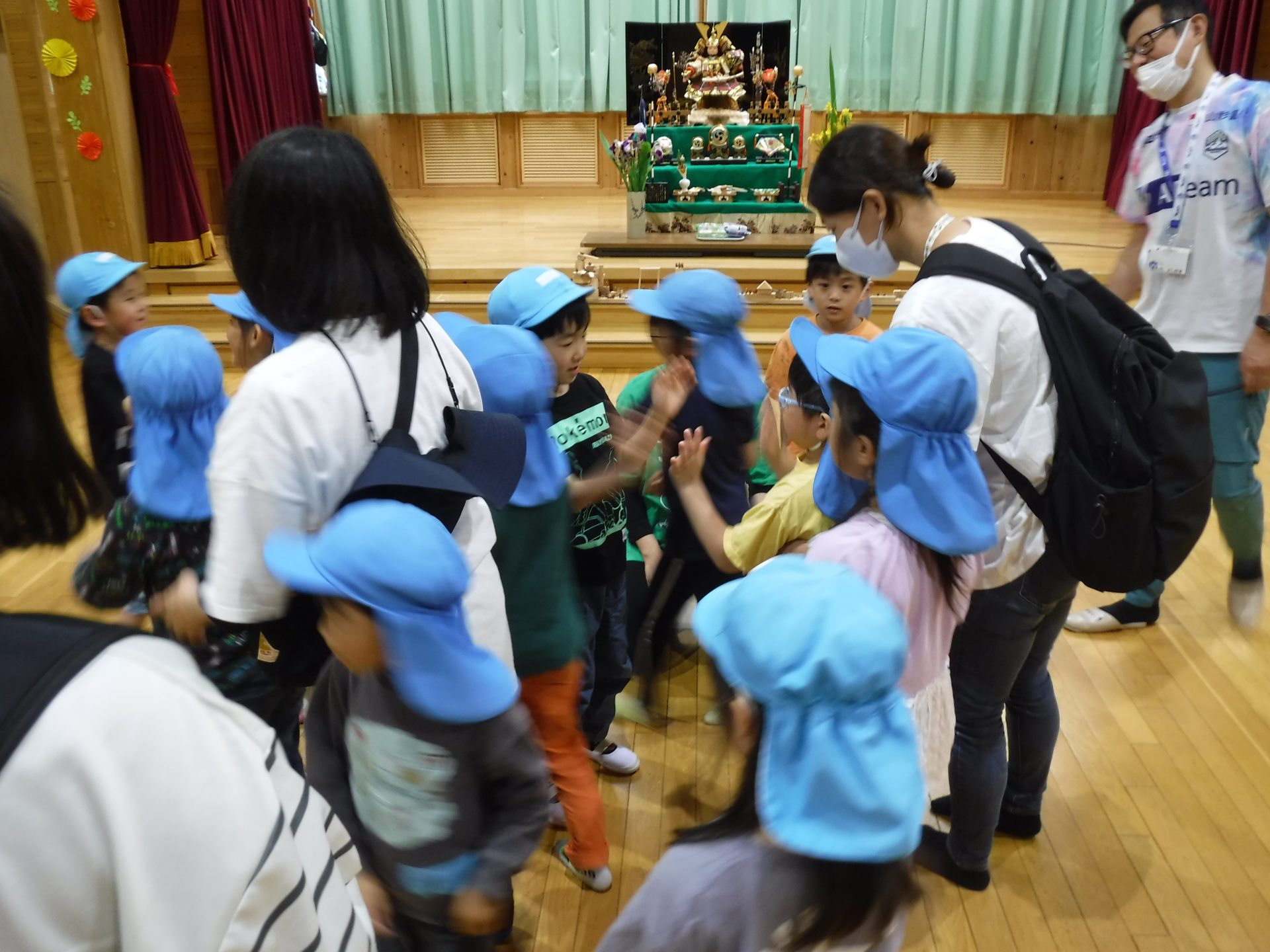 最後は、もう一度丸くなって、手をつなぎます。また次に会う日を楽しみに、さようならをしました。名残惜しそうに、タッチする子どもたちでした。