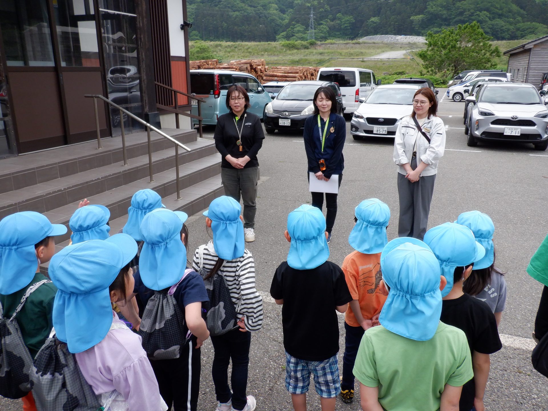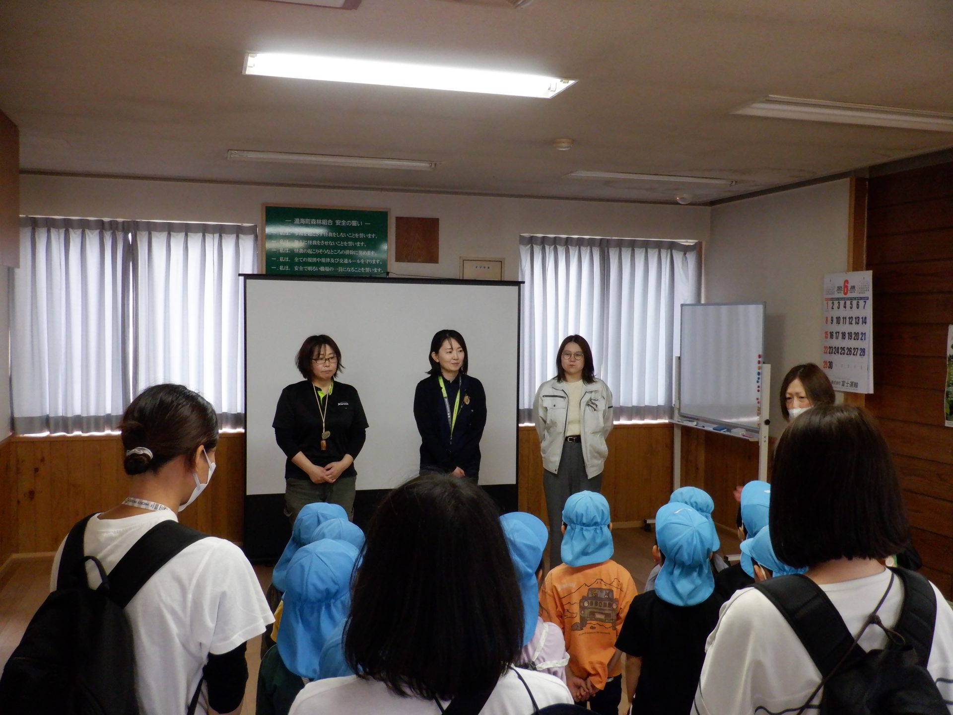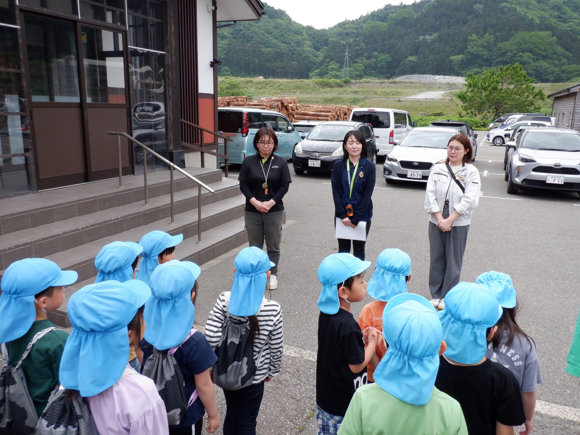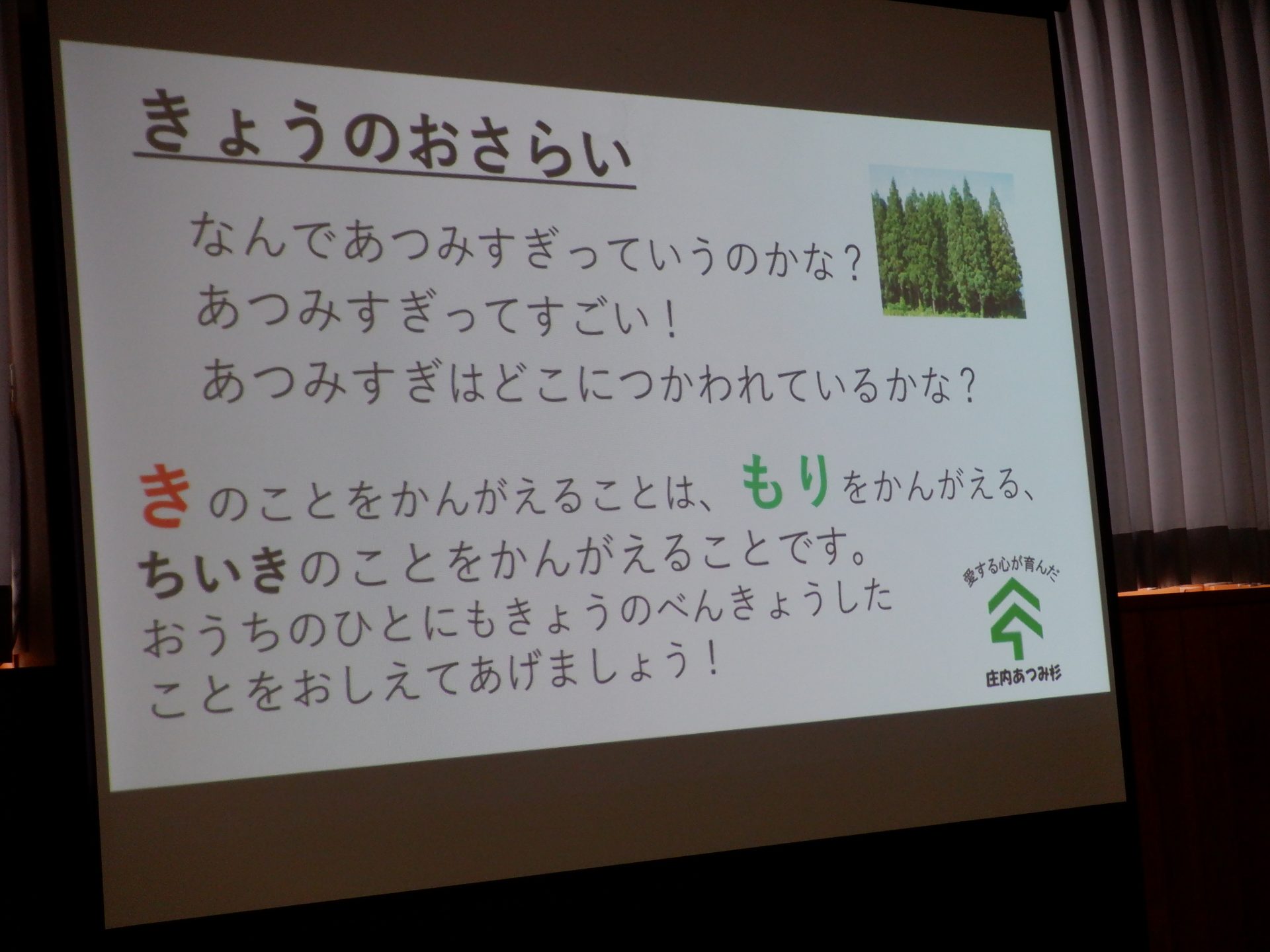バスに乗り込み、温海町森林組合に向けて出発です。森林組合までの間にも、”あつみ杉”は、あちこちに見えています。あつみ保育園の年長さんが、「あつみ杉はあれだよ」と教えてくれます。「どれどれ?」と、探しているうちに、あっという間に、到着です。さぁ、温海町森林組合では、どんな出会いがあるのでしょうか?