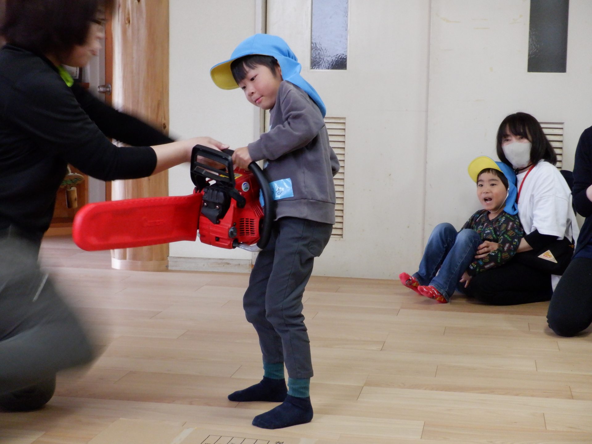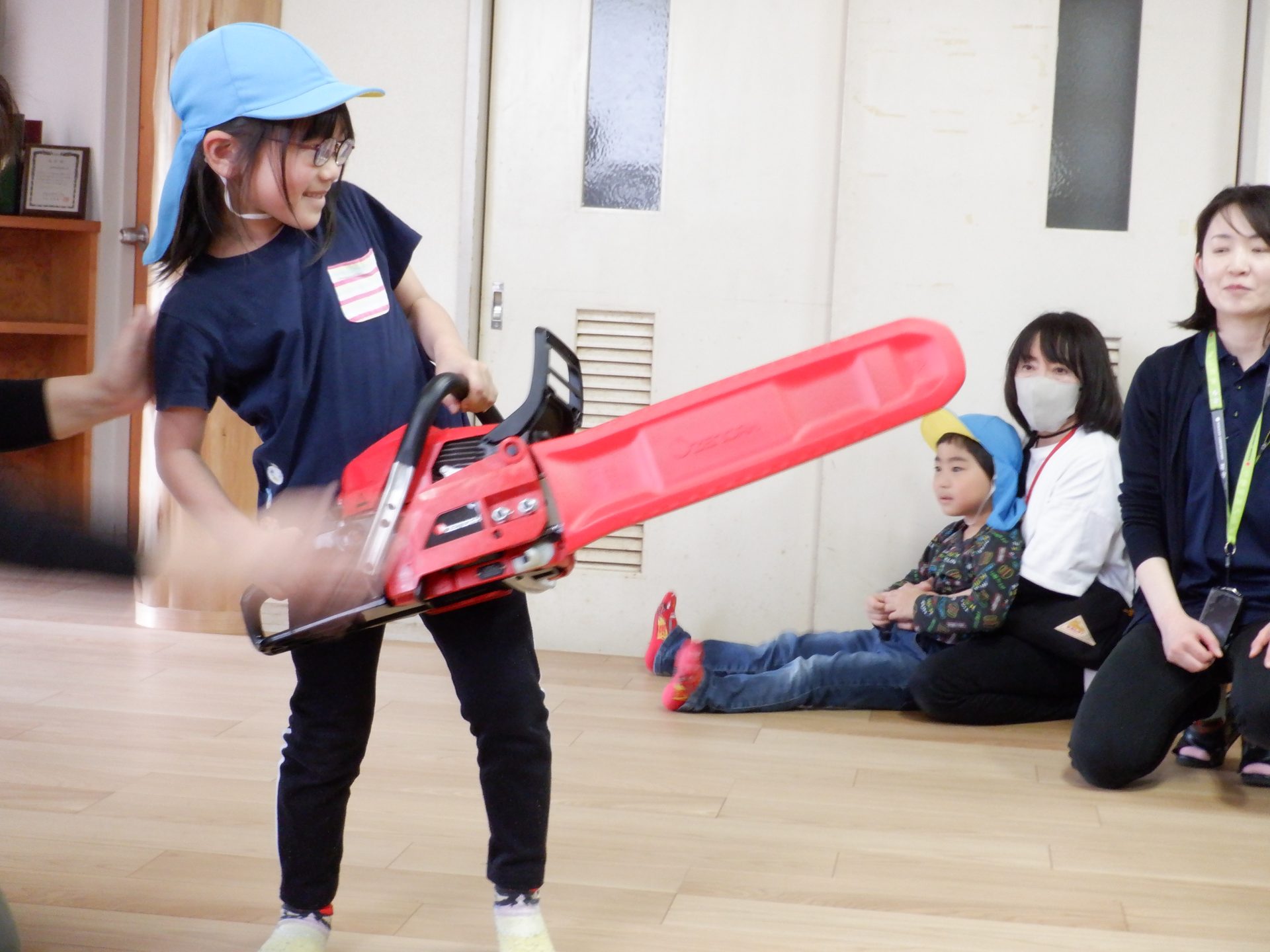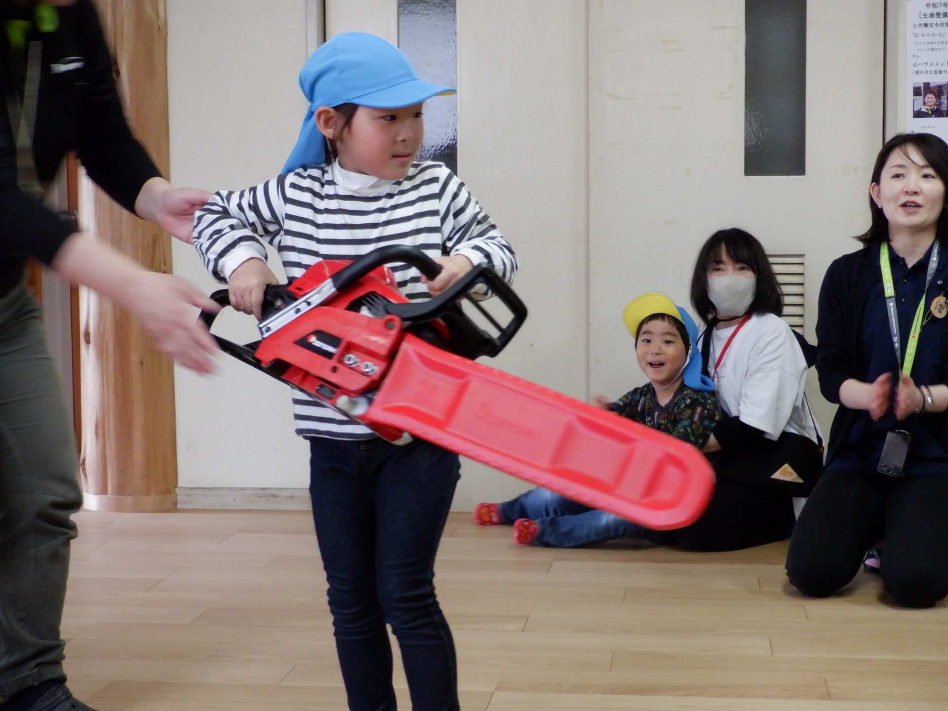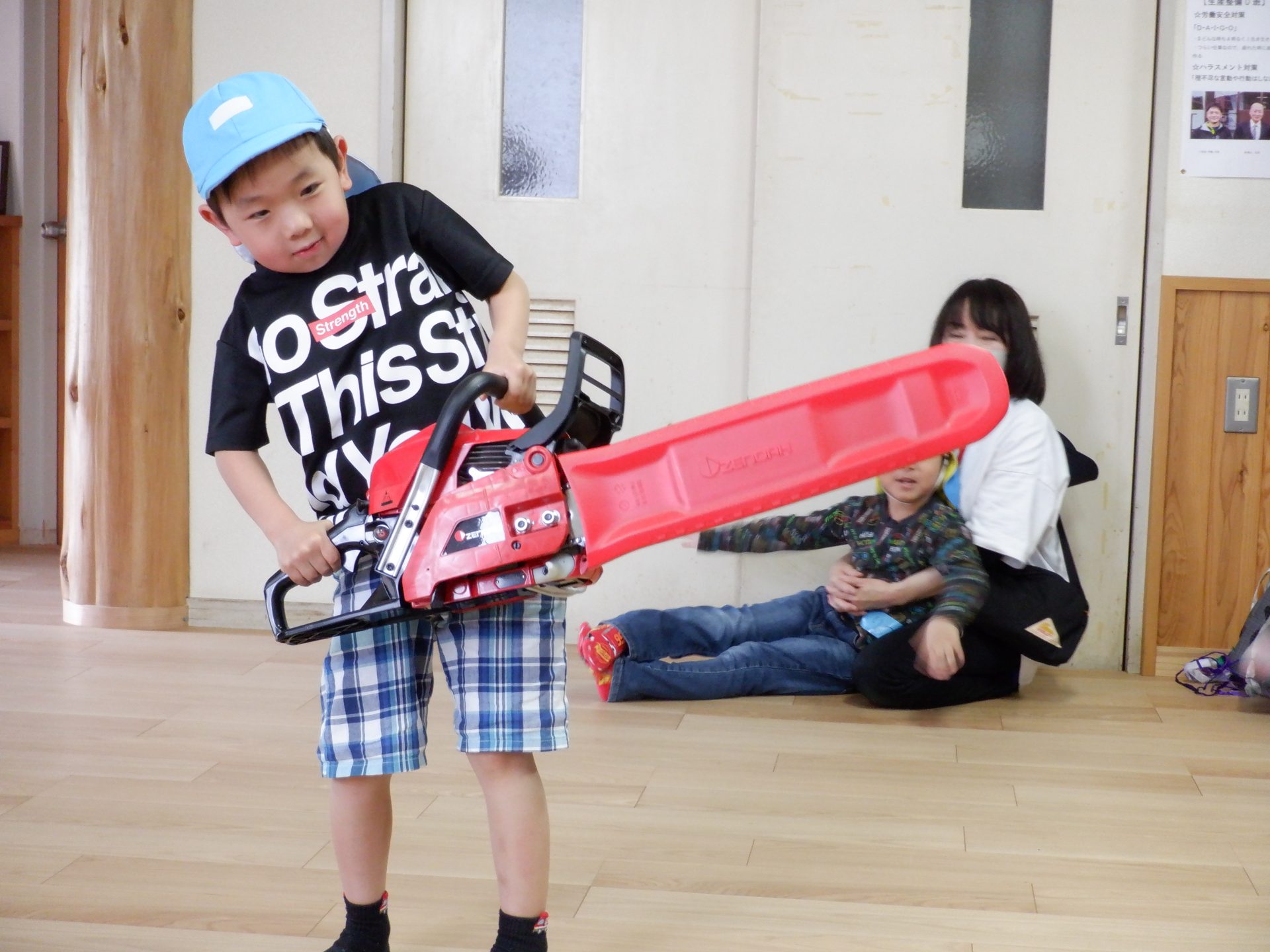 チェーンソーを、子どもたちは「重い」「おっとっと」「持てた!」「思ってたより、軽い」など、それぞれの感じ方で、持っていました。実際に持ってみると、子どもたちが一人で持つのは、なかなか大変な重さでしたよ。軽々と持ち上げる子もいたのは、びっくりです!あの重いチェーンソーで、木を切るのは、かなり大変な作業だということもわかりました。