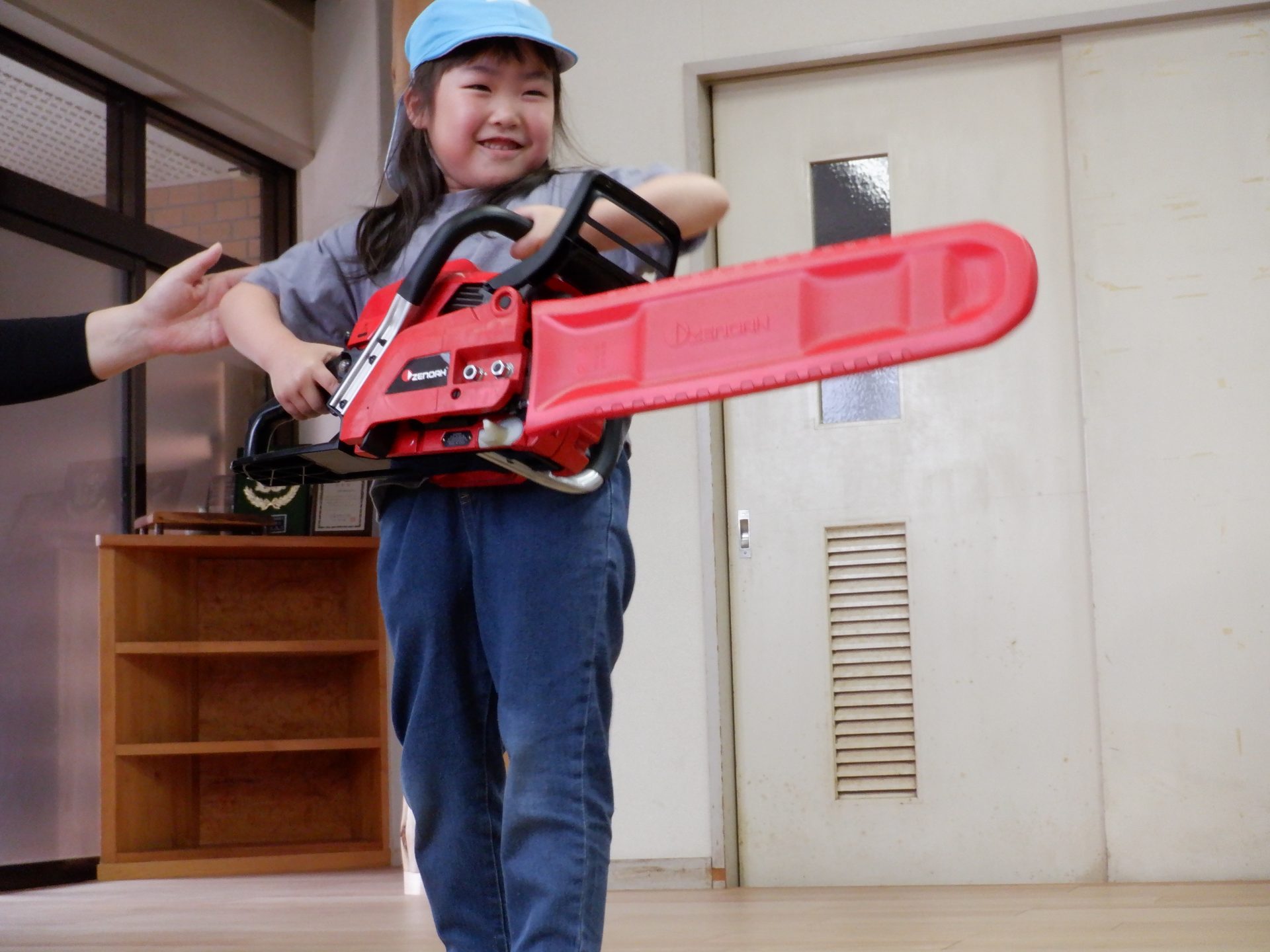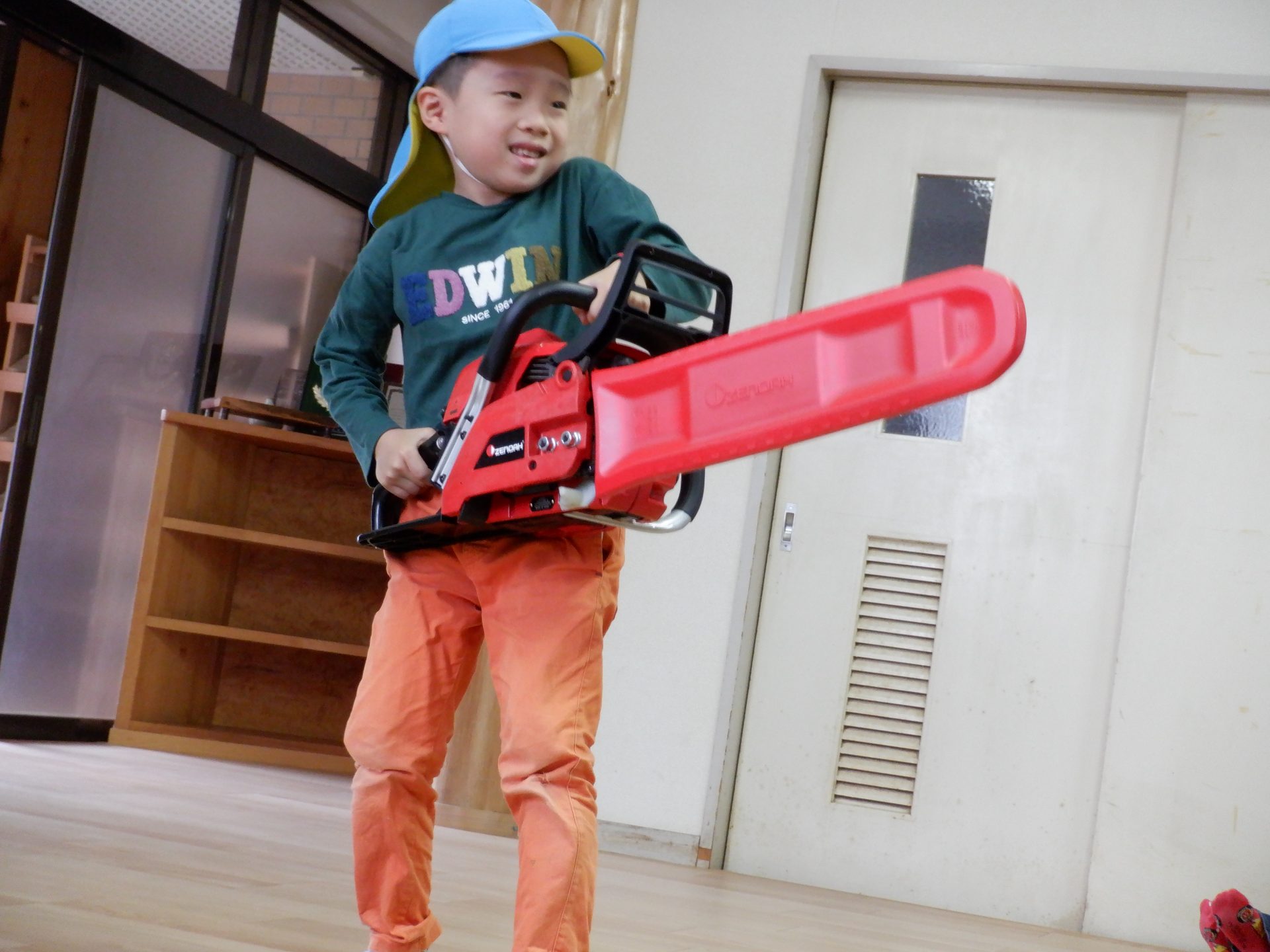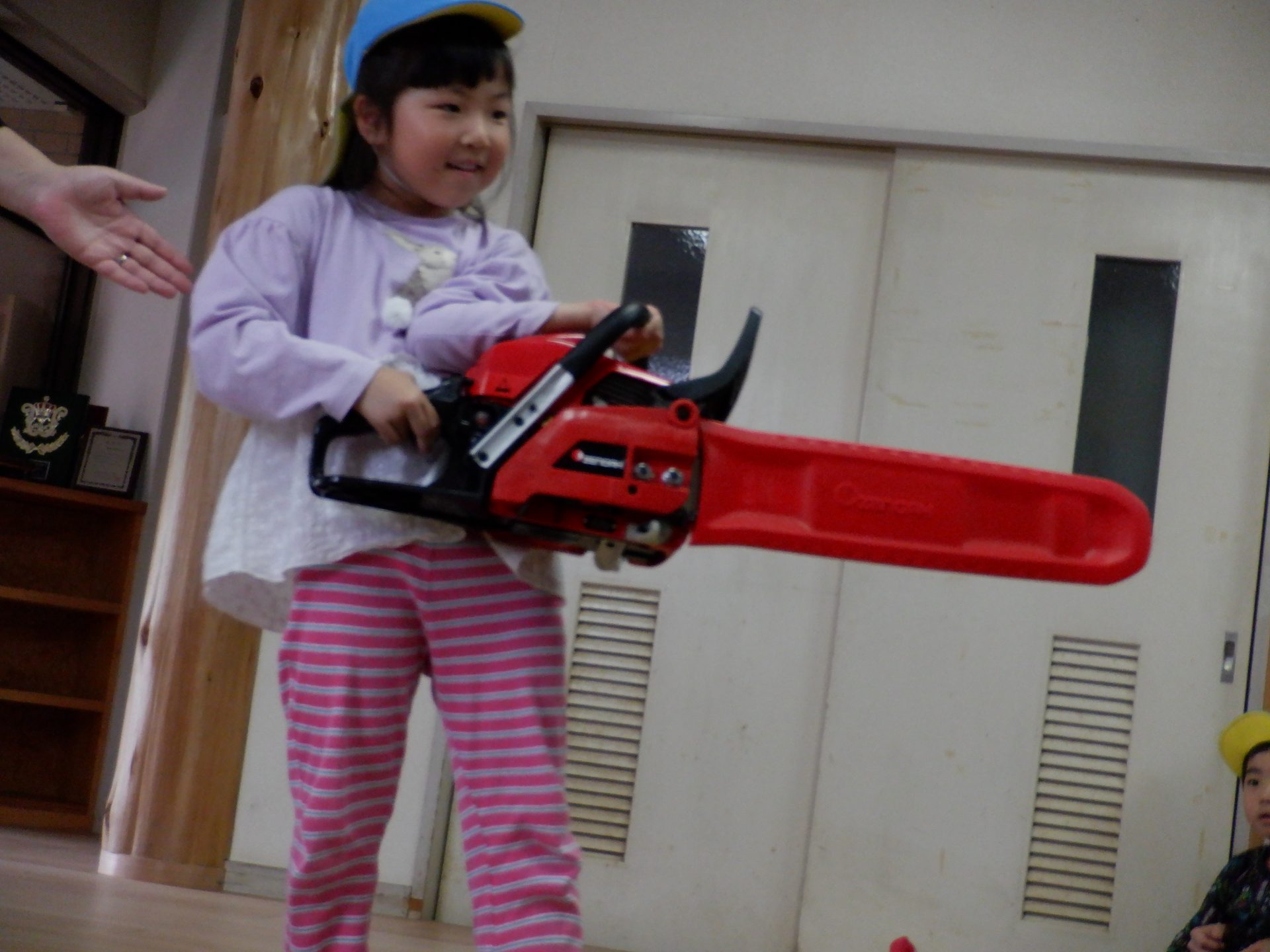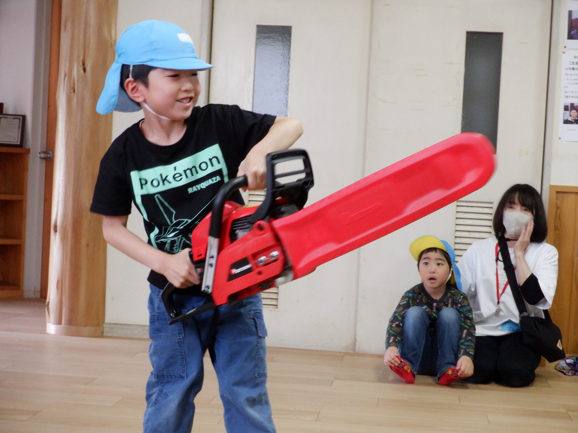 チェーンソーを、子どもたちは「重い」「おっとっと」「持てた!」「思ってたより、軽い」など、それぞれの感じ方で、持っていました。実際に持ってみると、子どもたちが一人で持つのは、なかなか大変な重さでしたよ。軽々と持ち上げる子もいたのは、びっくりです!あの重いチェーンソーで、木を切るのは、かなり大変な作業だということもわかりました。