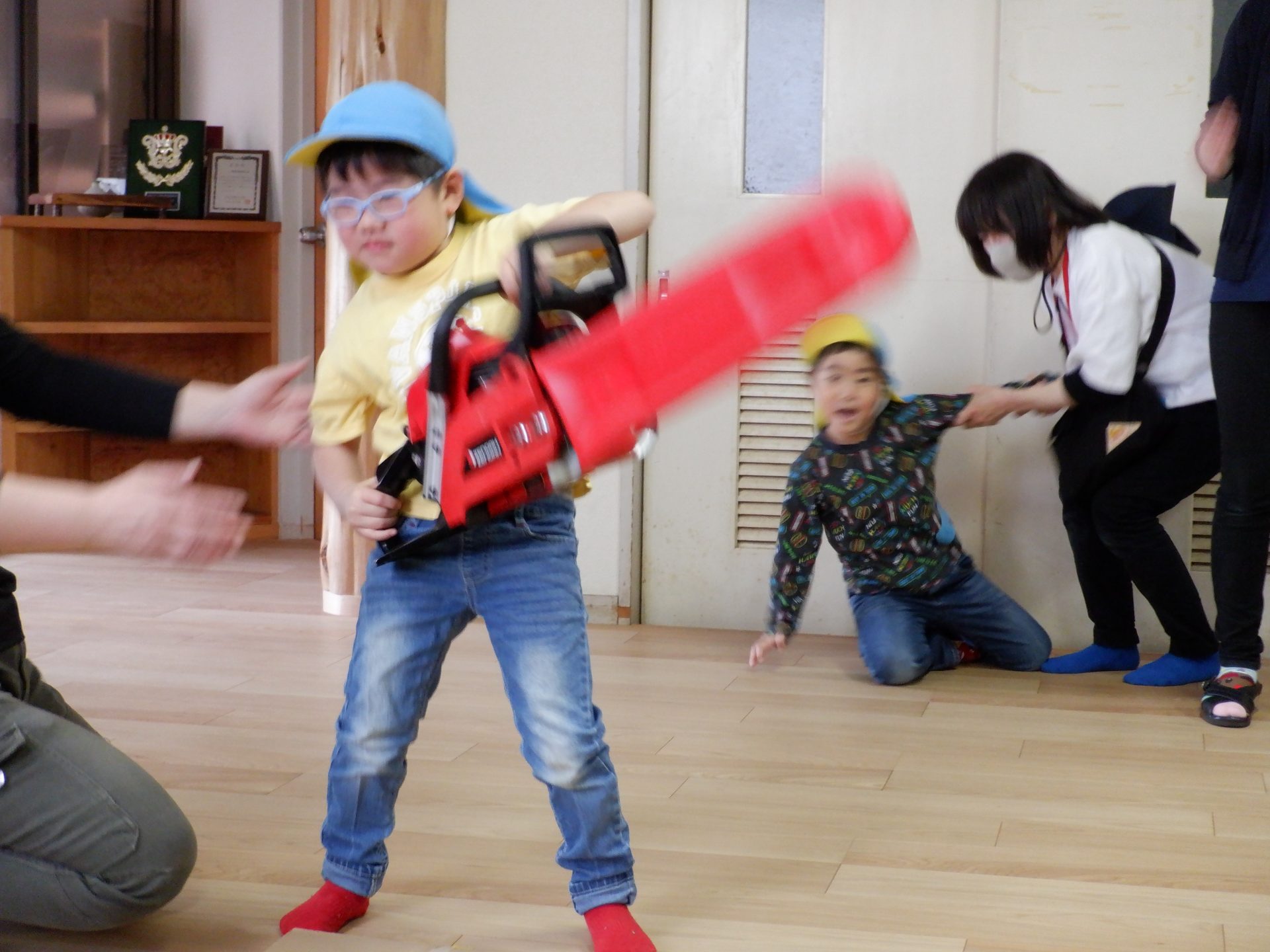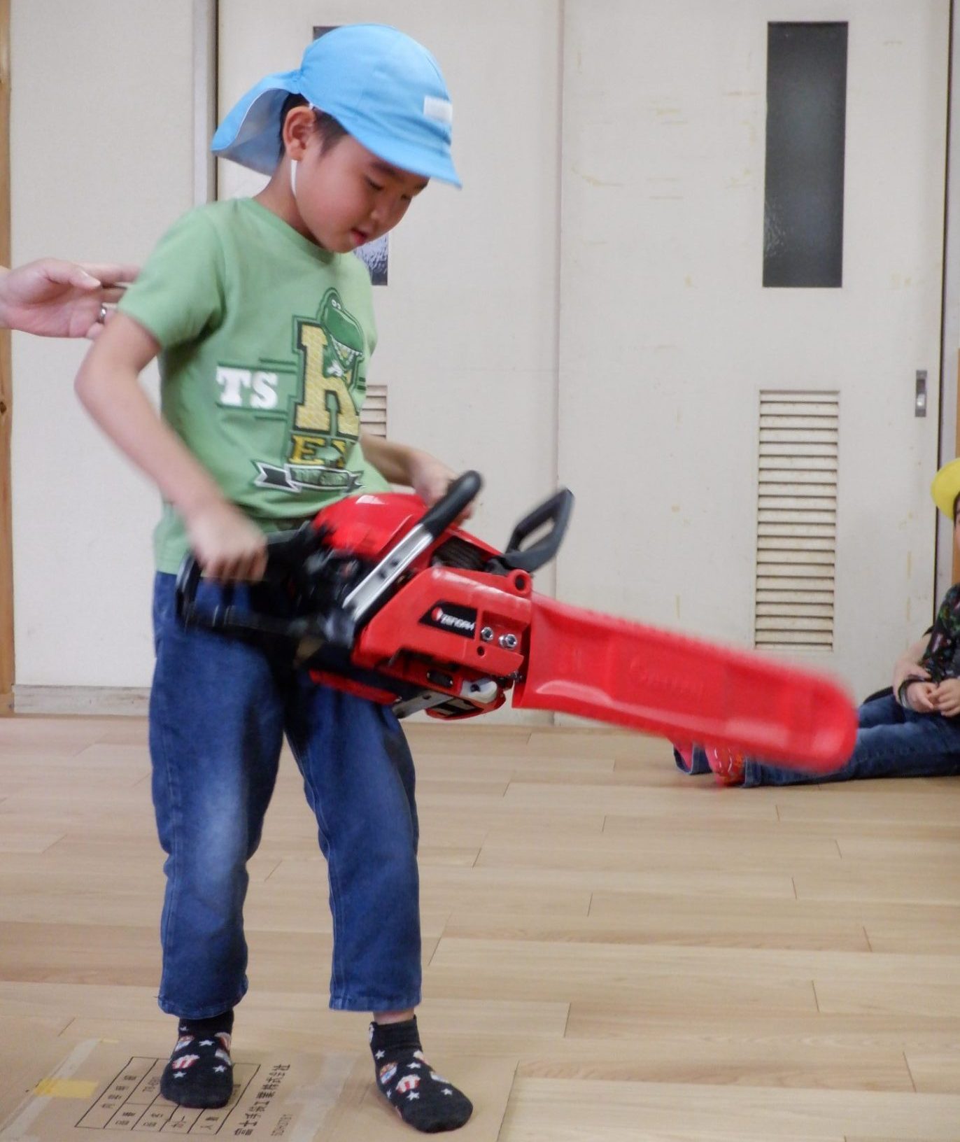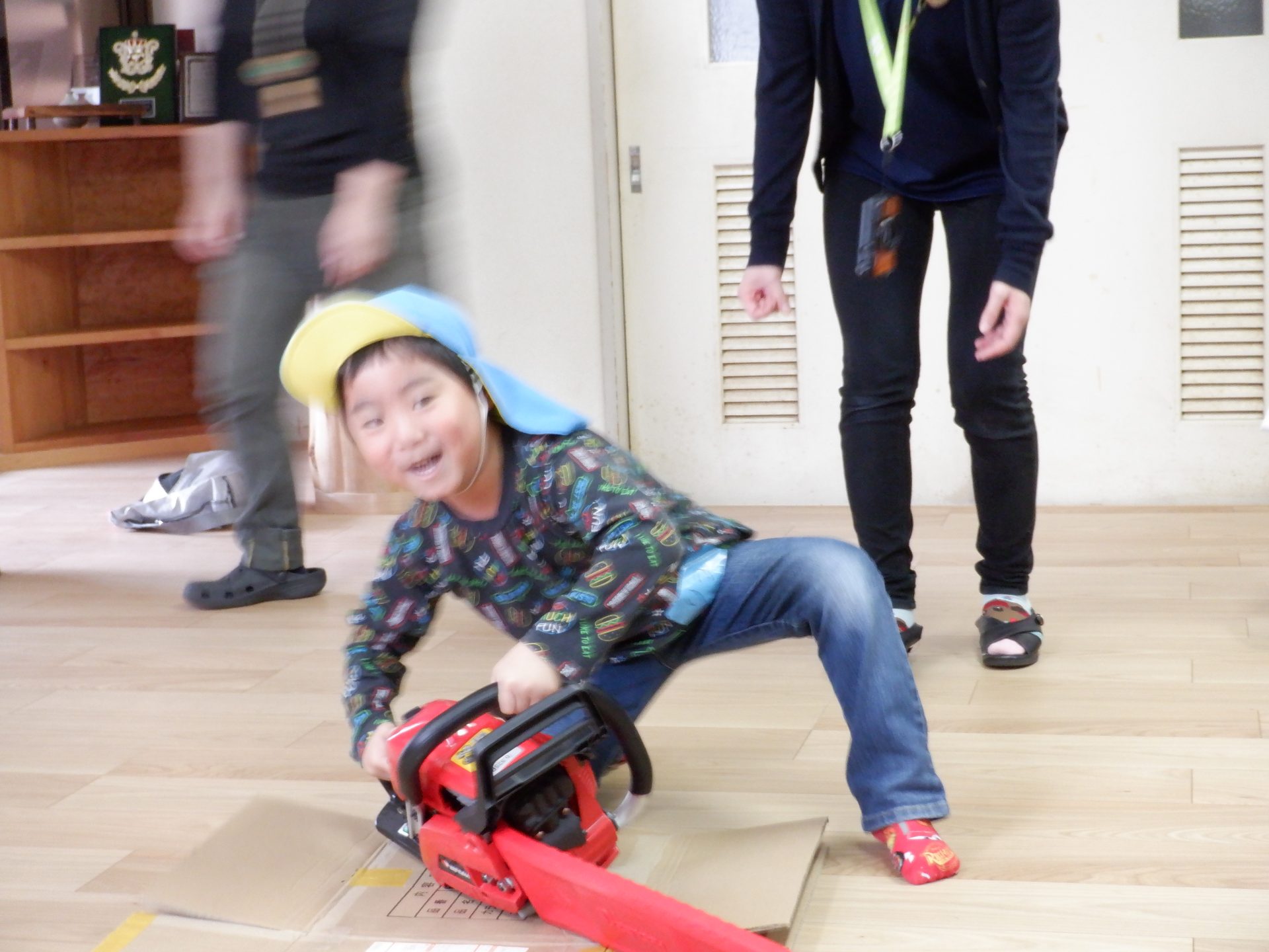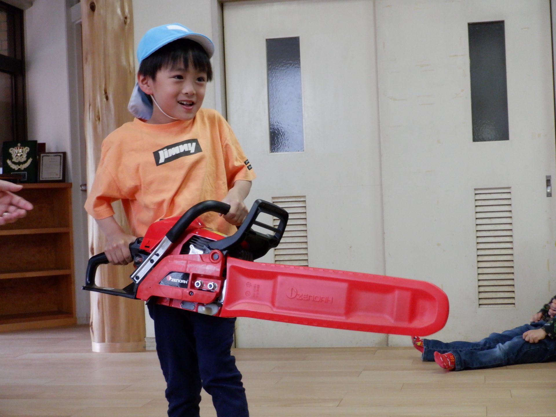 チェーンソーを、子どもたちは「重い」「おっとっと」「持てた!」「思ってたより、軽い」など、それぞれの感じ方で、持っていました。実際に持ってみると、子どもたちが一人で持つのは、なかなか大変な重さでしたよ。軽々と持ち上げる子もいたのは、びっくりです!あの重いチェーンソーで、木を切るのは、かなり大変な作業だということもわかりました。