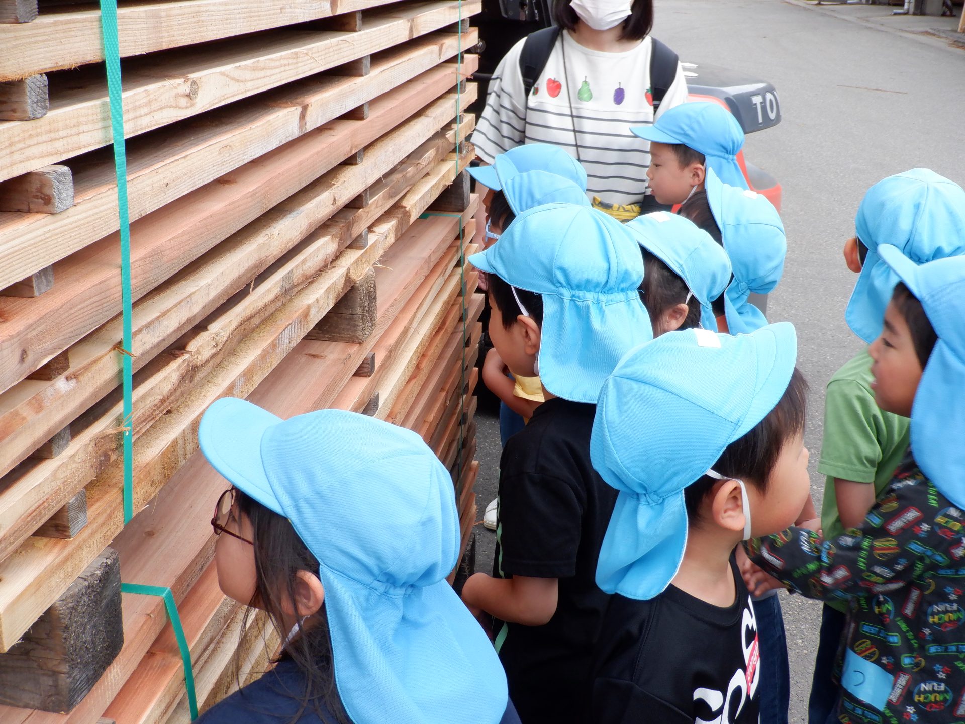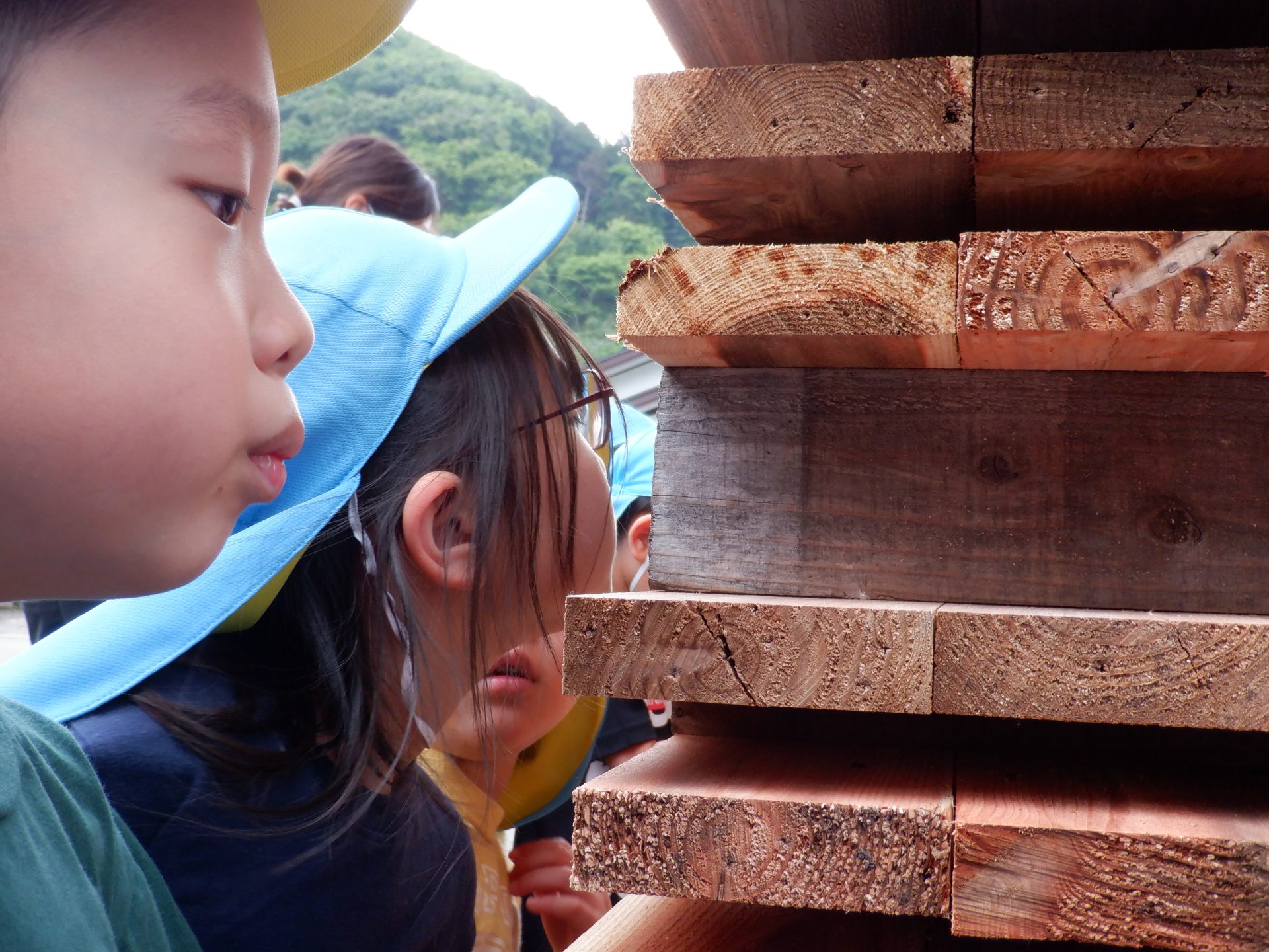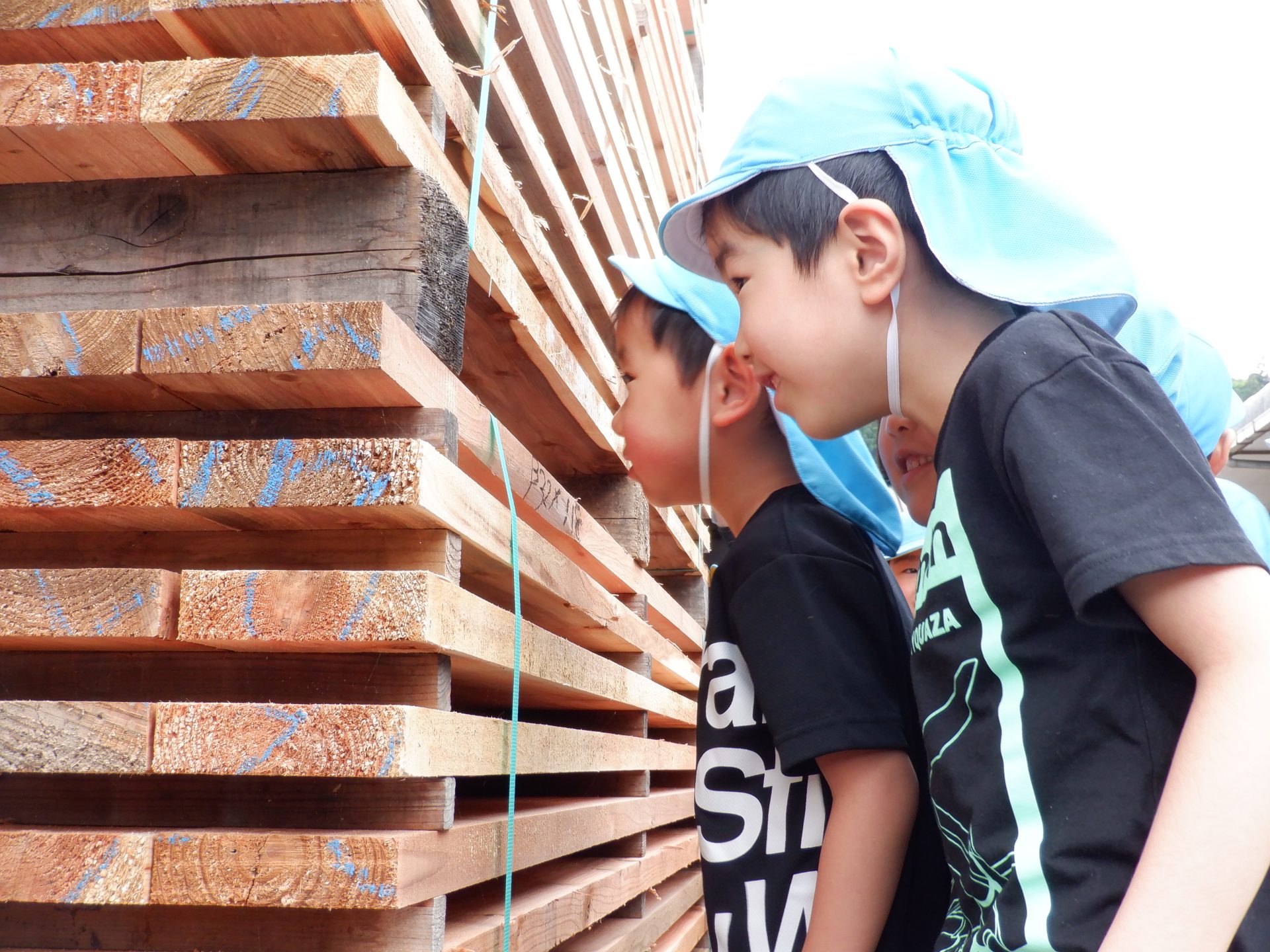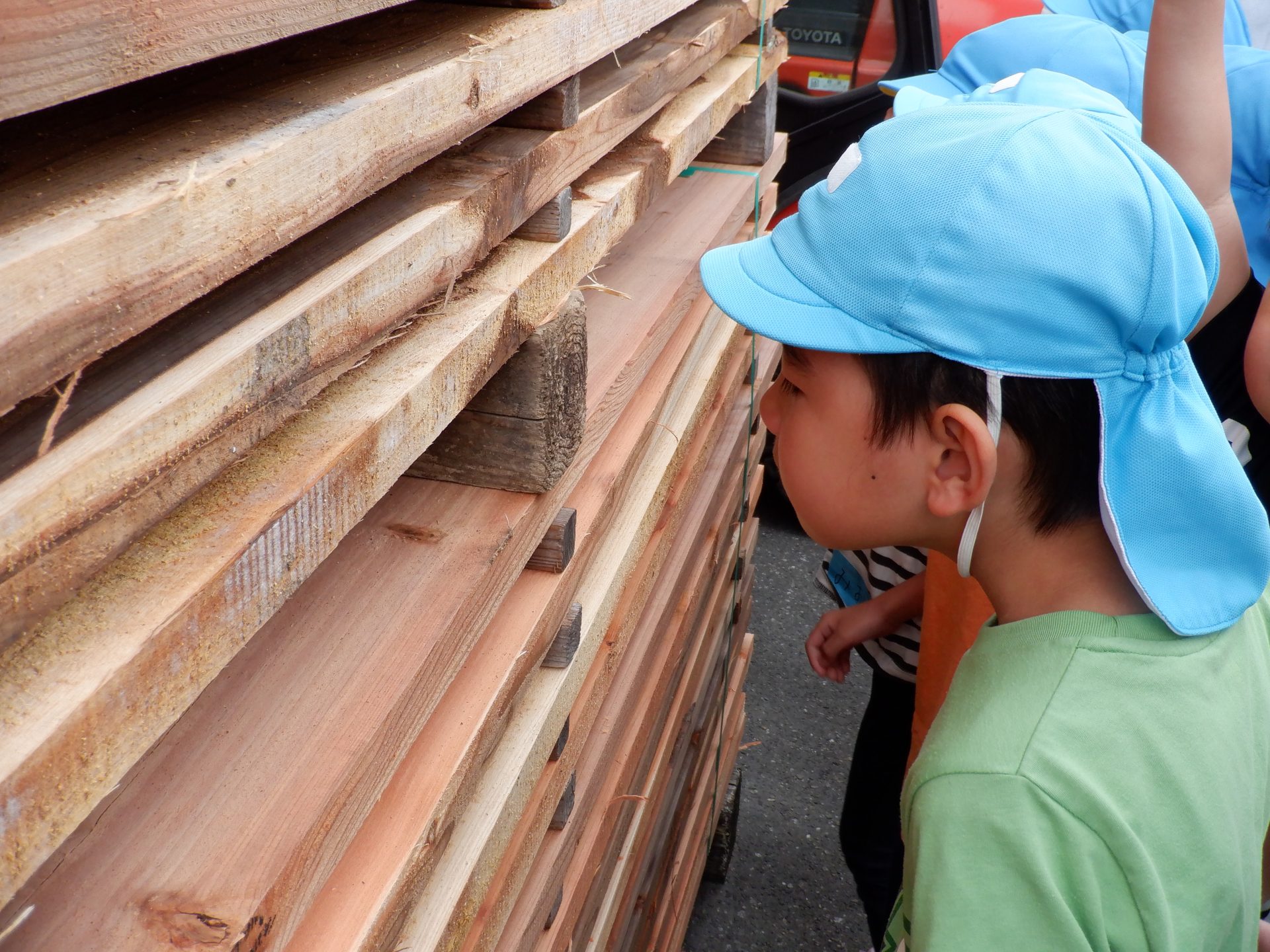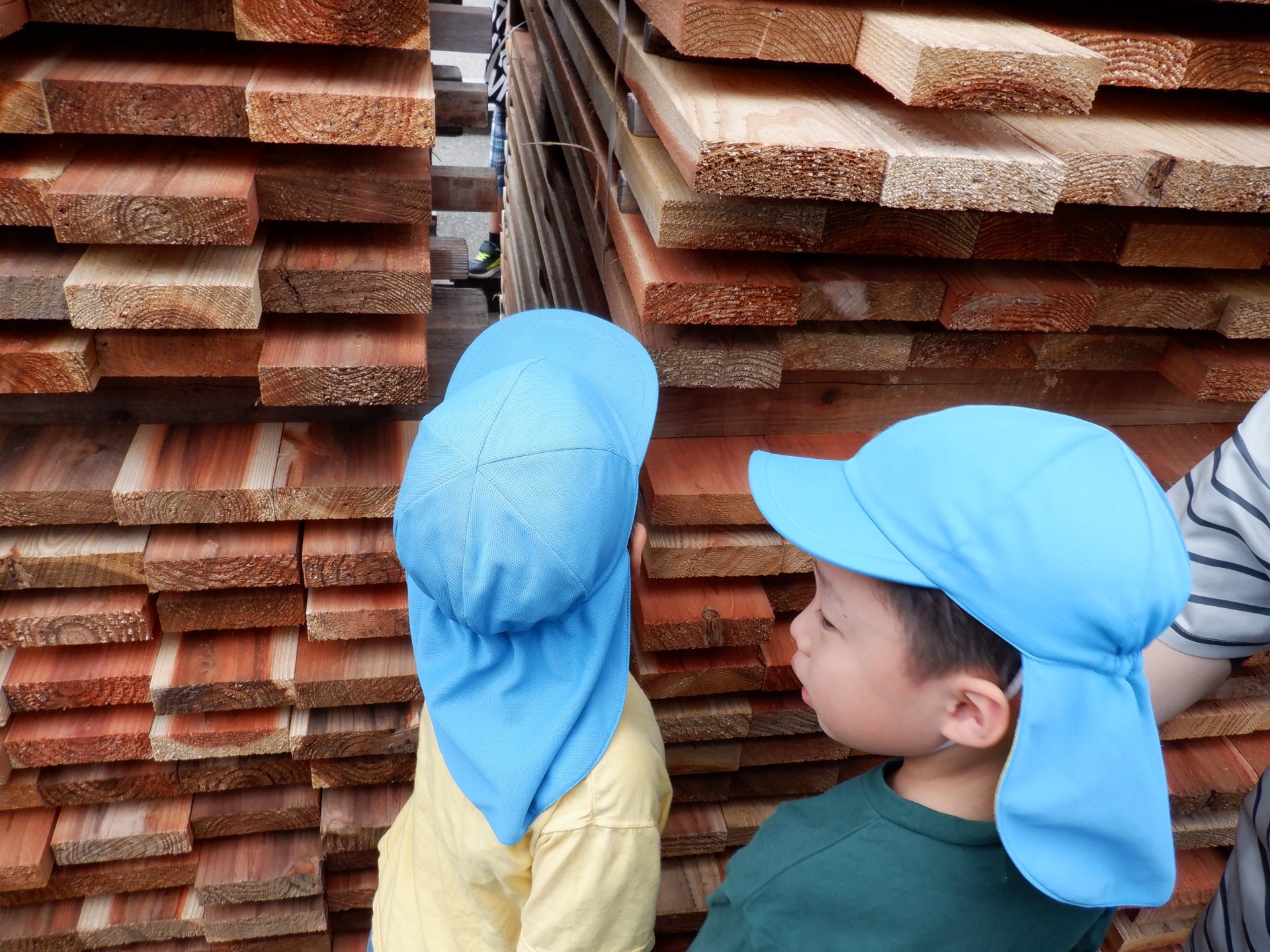 次に、外に出て、工場見学です。外に出ると、あつみ杉のいい匂いが広がっています。板状に加工されたあつみ杉がたくさん並んでいました。早速、匂いをかいだり、触ってみたりと、好奇心がとまりません。