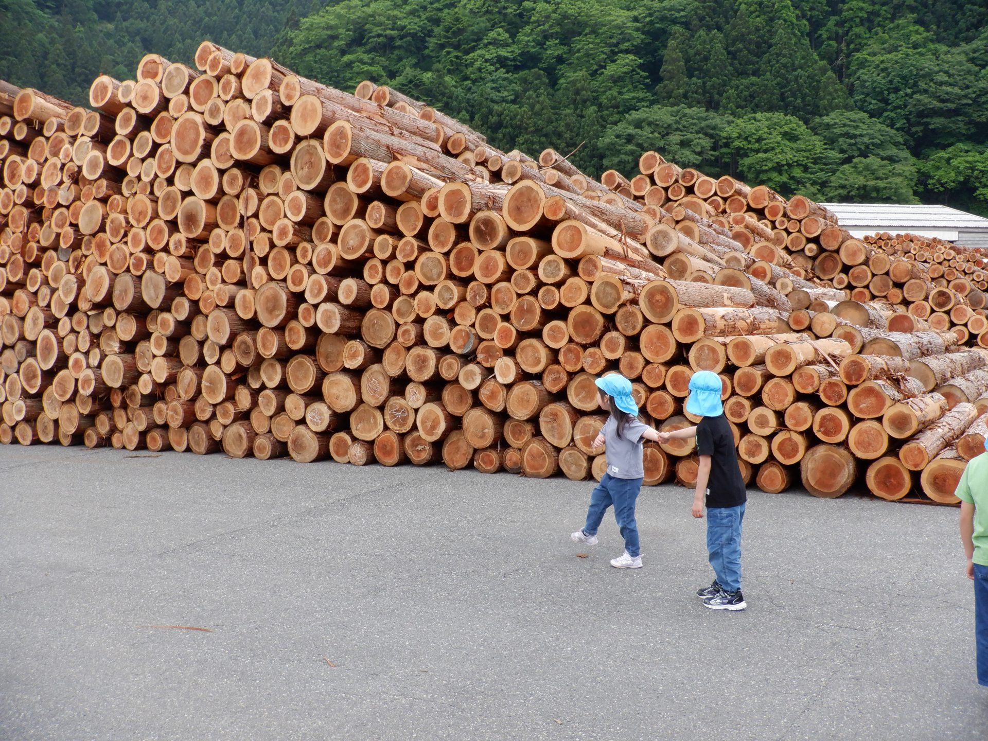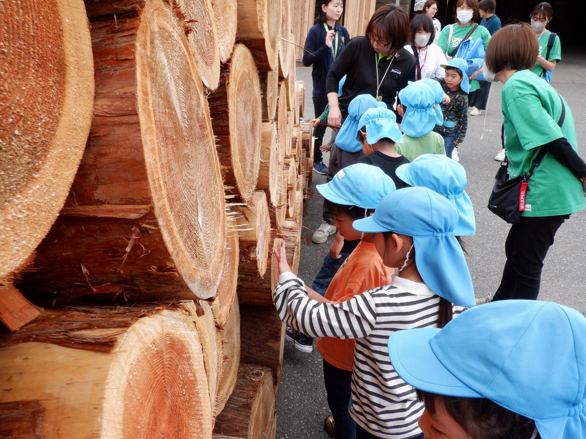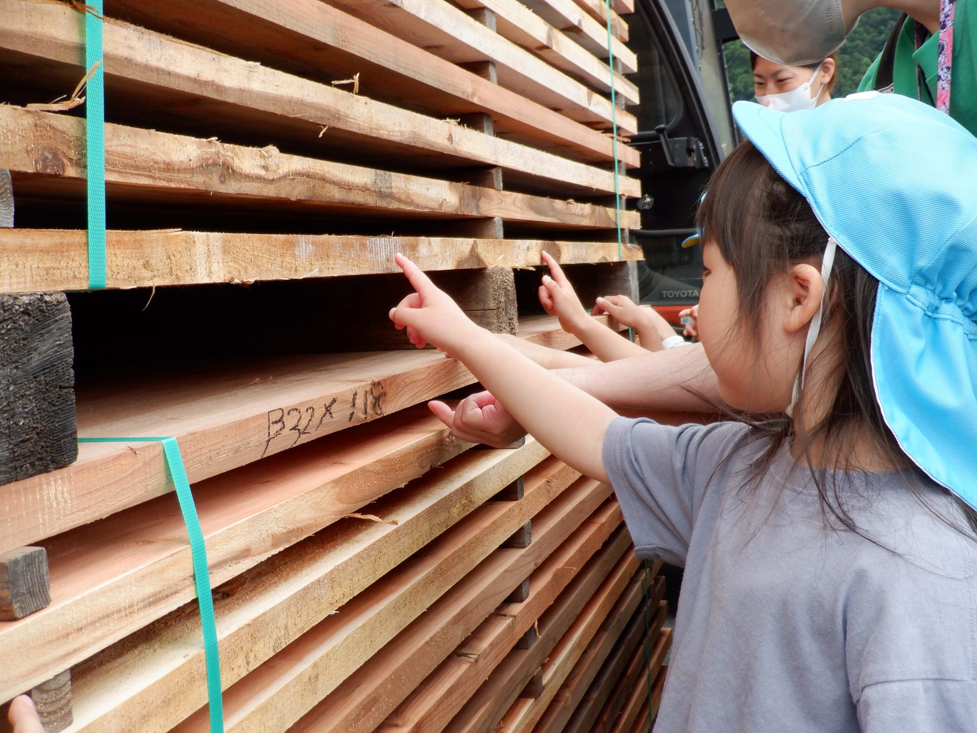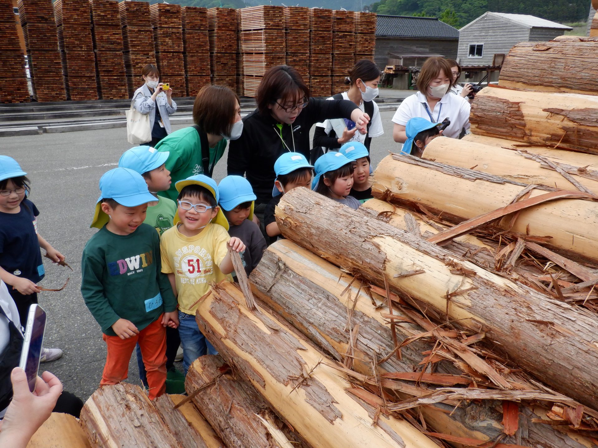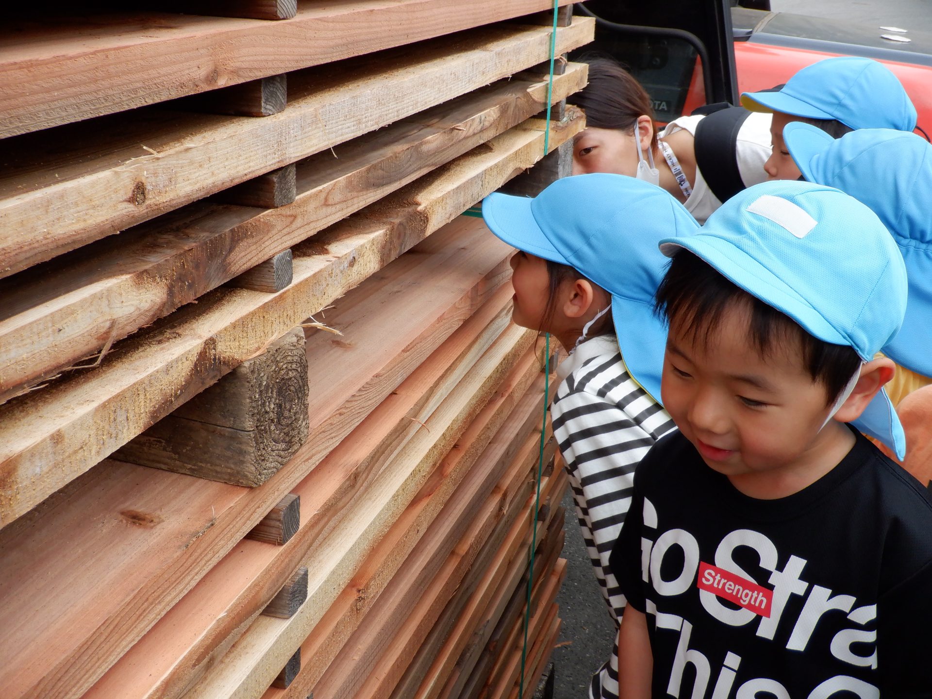 次に、外に出て、工場見学です。外に出ると、あつみ杉のいい匂いが広がっています。板状に加工されたあつみ杉がたくさん並んでいました。早速、匂いをかいだり、触ってみたりと、好奇心がとまりません。