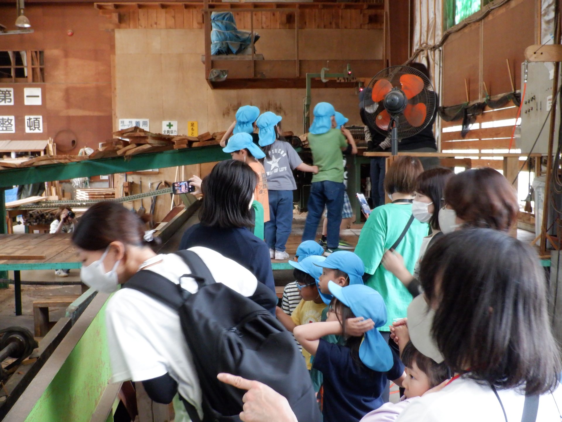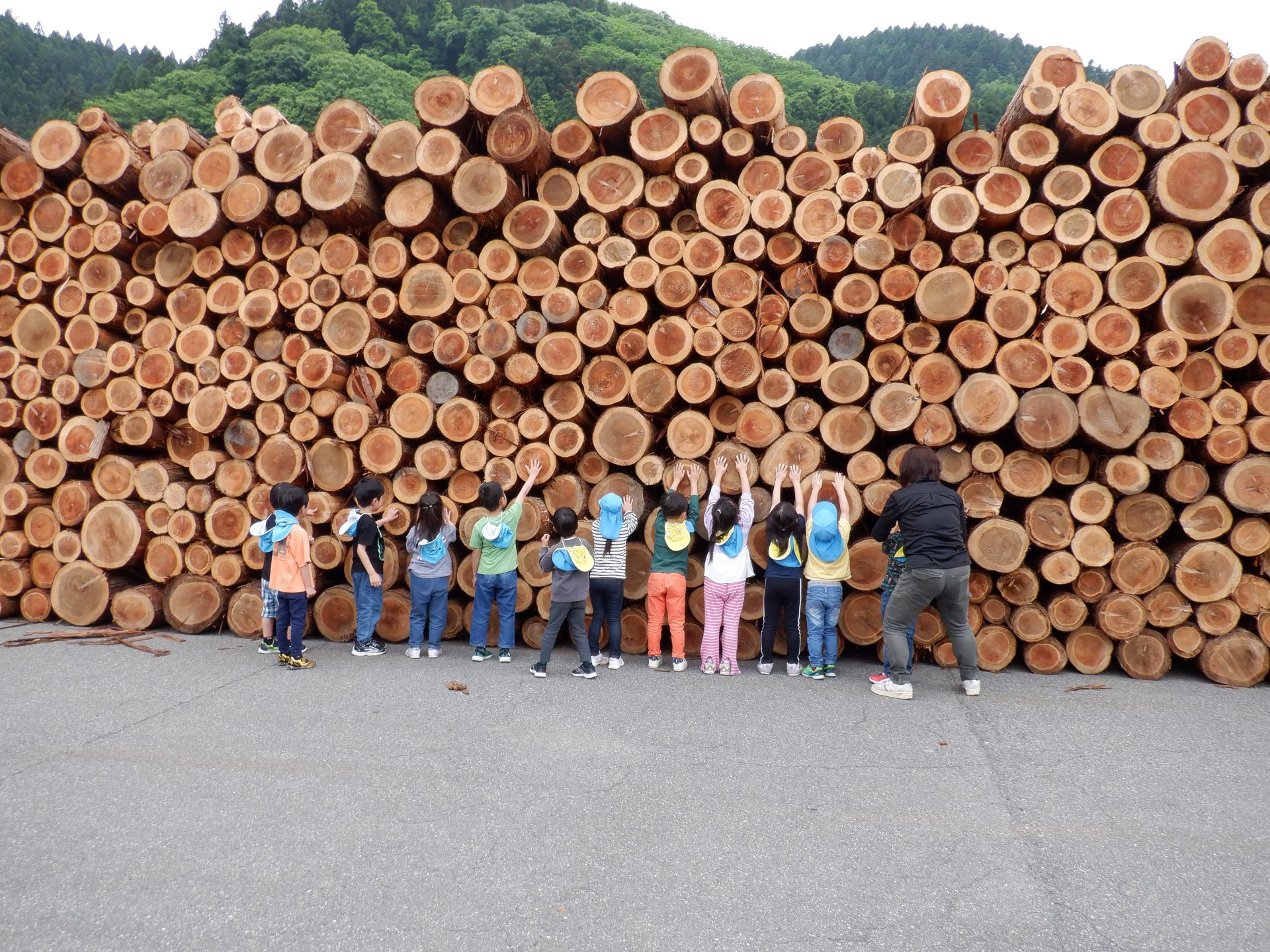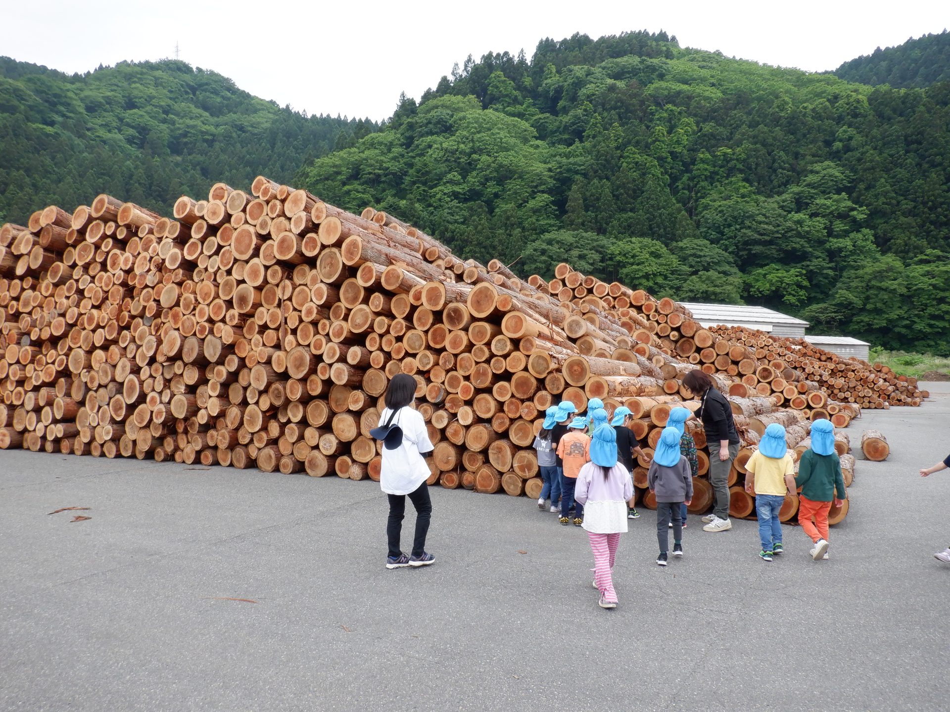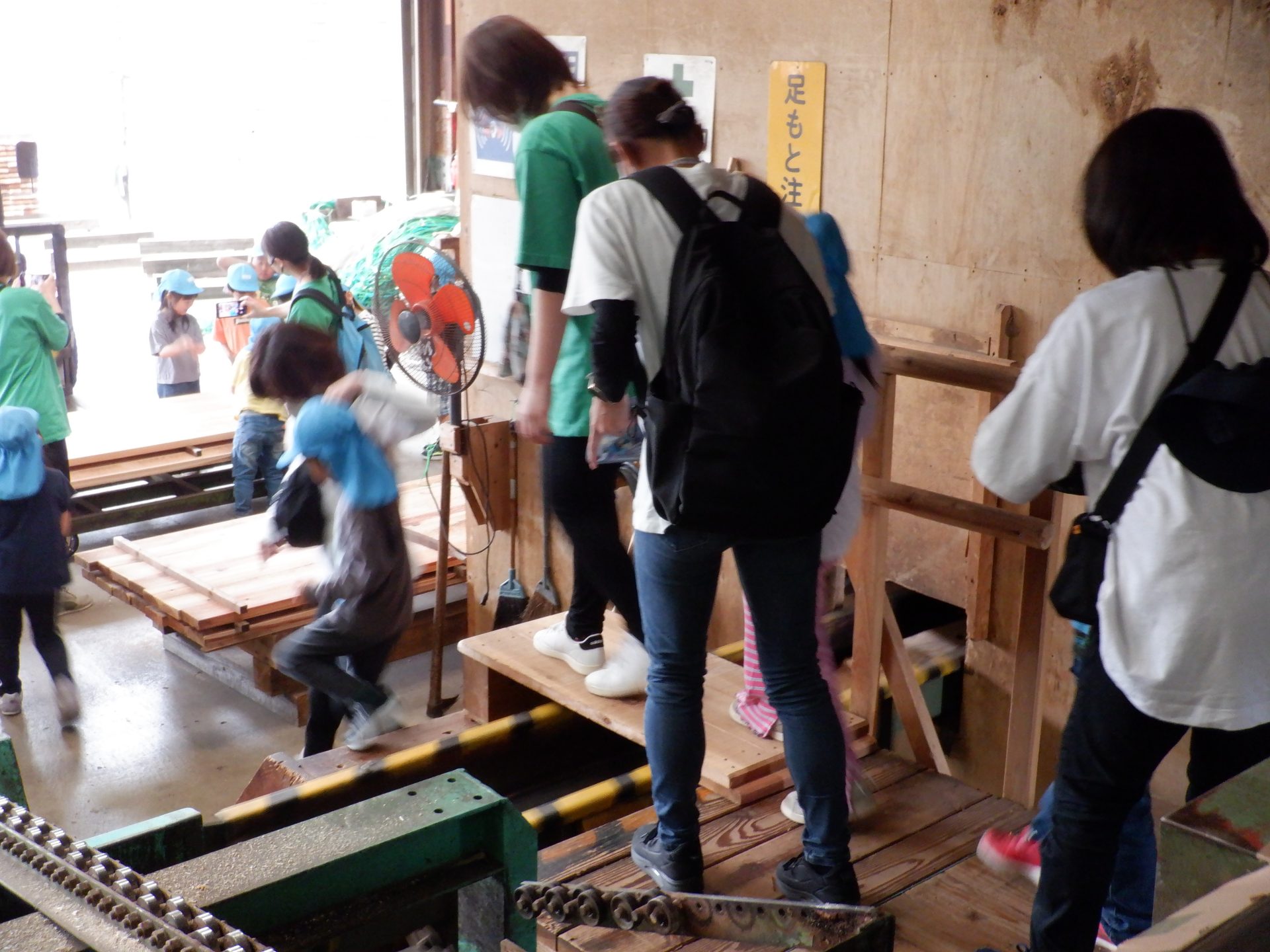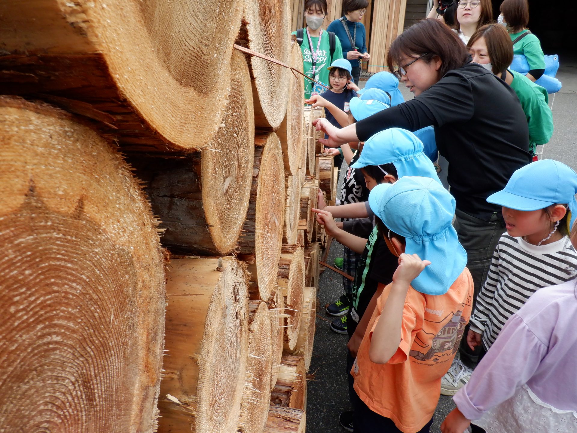 次に、外に出て、工場見学です。外に出ると、あつみ杉のいい匂いが広がっています。板状に加工されたあつみ杉がたくさん並んでいました。早速、匂いをかいだり、触ってみたりと、好奇心がとまりません。