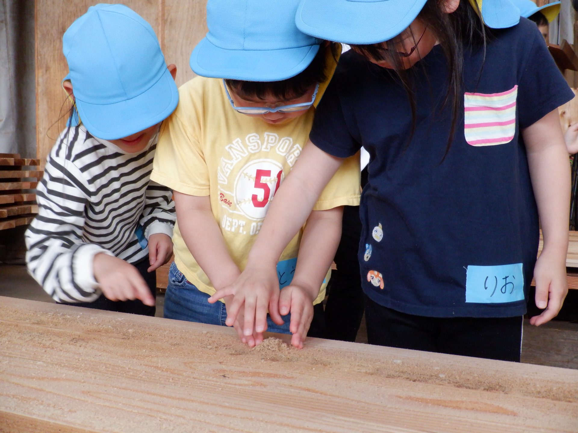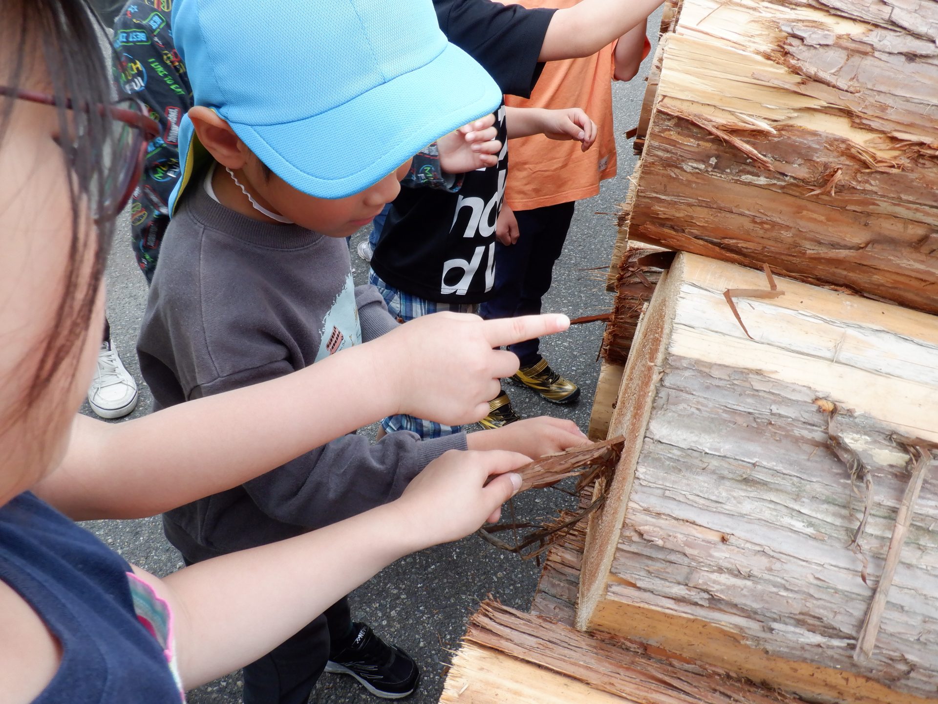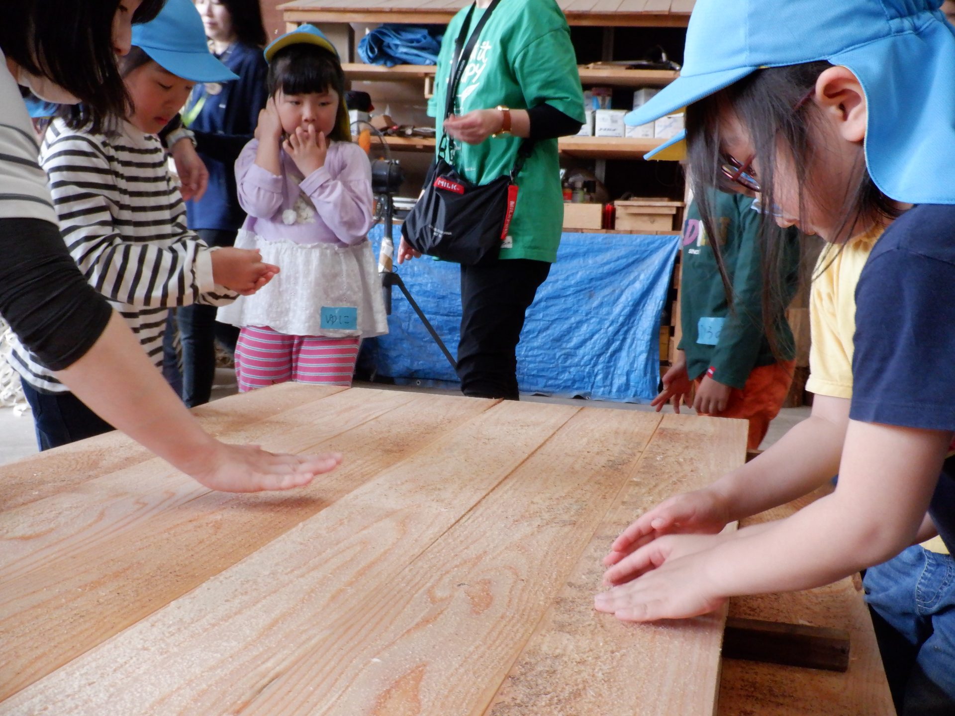 機械に、どんどん杉が吸い込まれていき、皮が削られ、板状に切られていきます。大きな音が響き、思わず耳を塞ぐ子もいました。板状になった杉は、さっきと触ったところが違うので、つるつるしていました。木くずもついていて、集めてお山にしたり、匂いを嗅いだりと、違いをたのしみました。