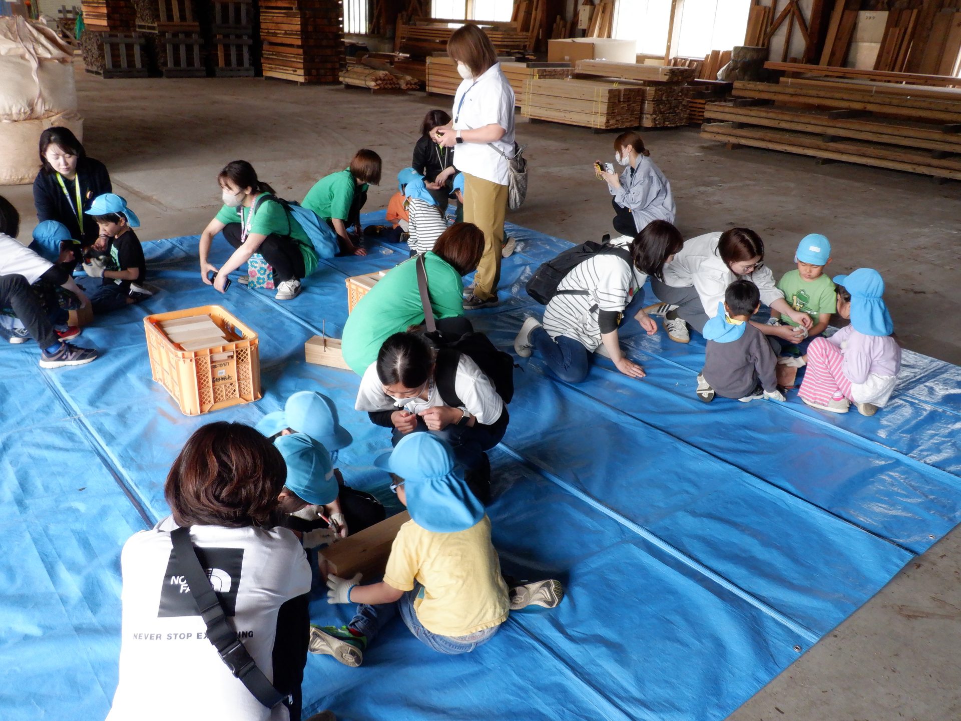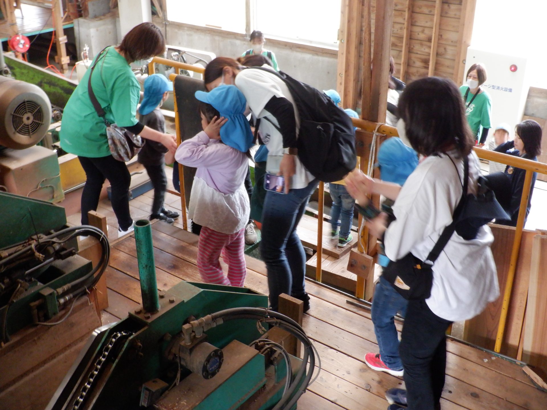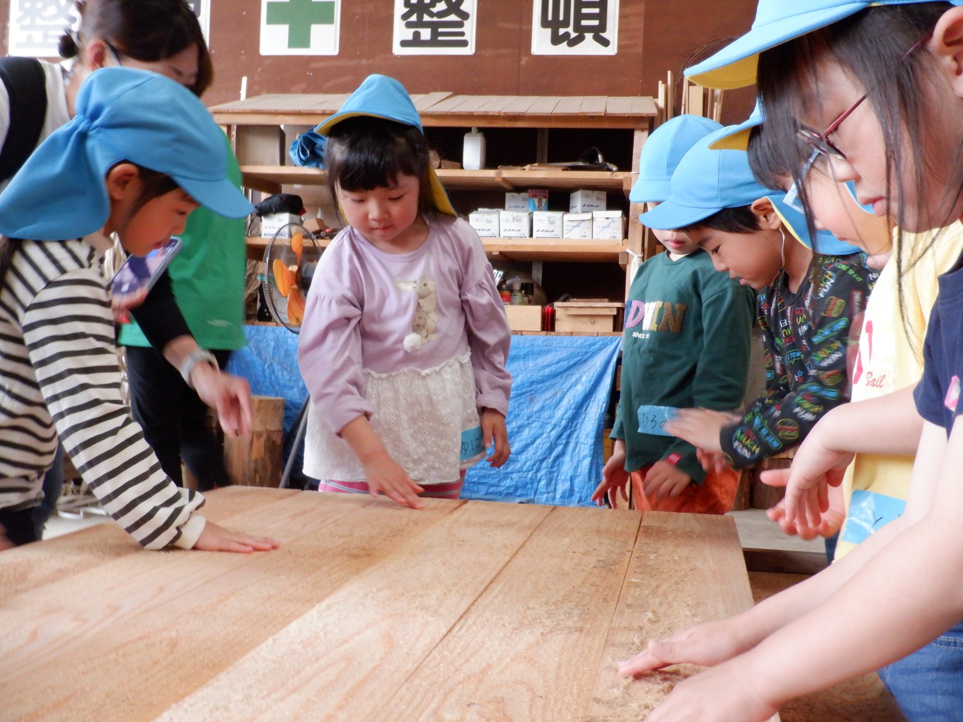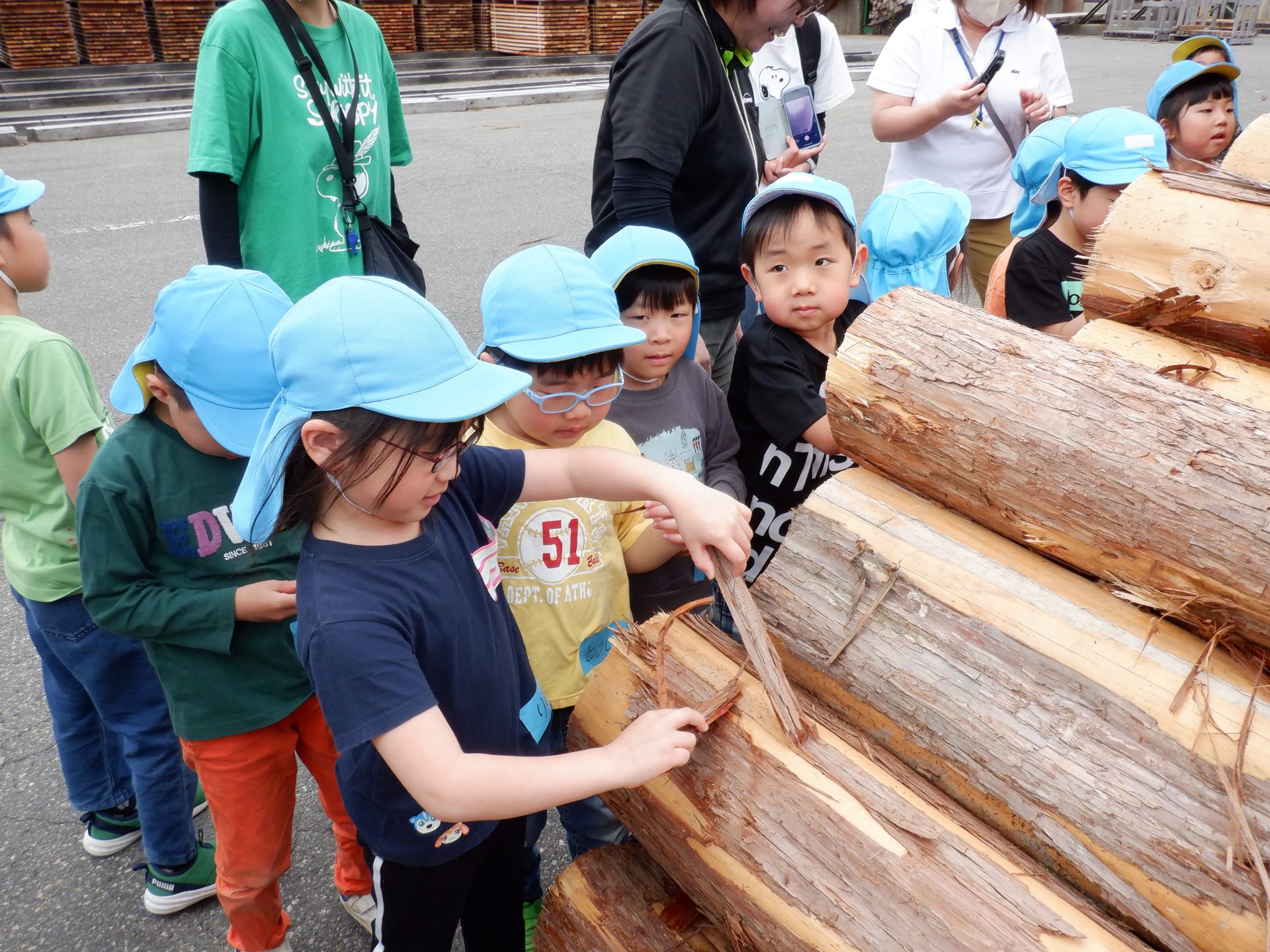 機械に、どんどん杉が吸い込まれていき、皮が削られ、板状に切られていきます。大きな音が響き、思わず耳を塞ぐ子もいました。板状になった杉は、さっきと触ったところが違うので、つるつるしていました。木くずもついていて、集めてお山にしたり、匂いを嗅いだりと、違いをたのしみました。