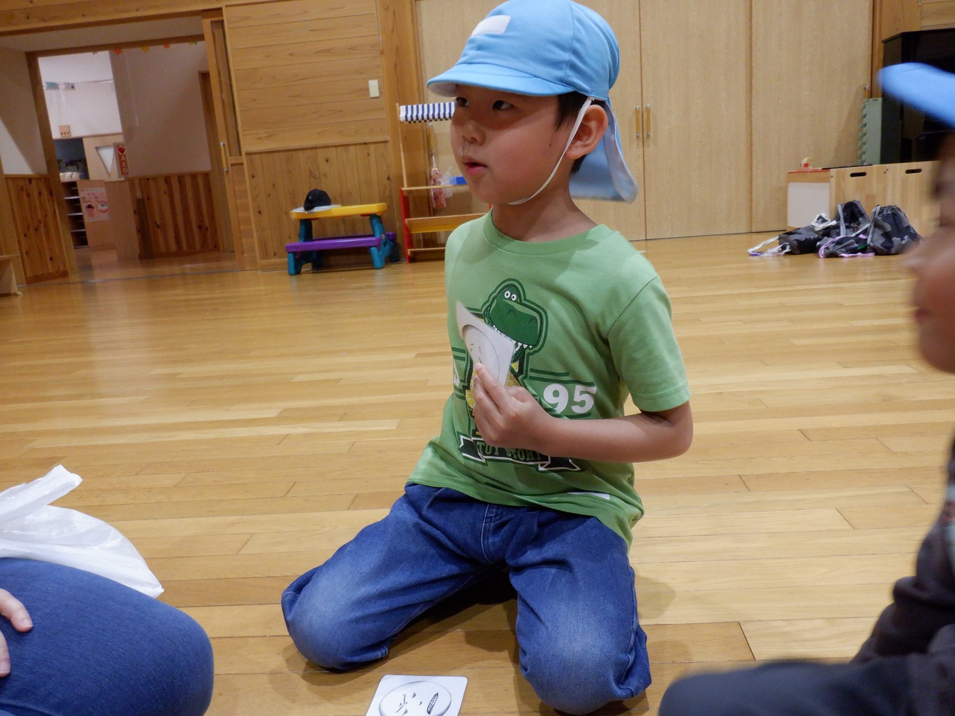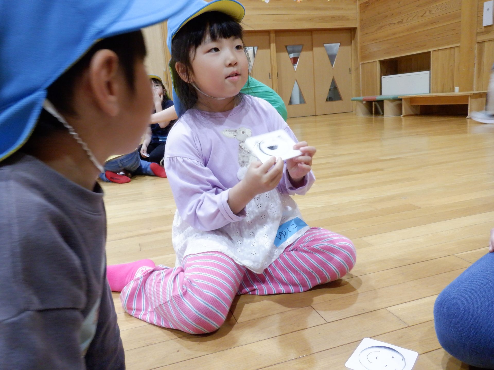 今、感じていることや、森林組合での体験を通して感じたことを、言葉とカードで伝えあいました。朝、登園してすぐの気持ちはどれだったのか?、変化はあったのか?も、話しました。始まりの会では、緊張した表情や声でしたが、振り返りには、堂々と発表し、和らいだ表情が多く見られ、今日が、子どもにとってどんな活動になったのか、伝わってきました。