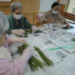 始めに6月は、職員が持参したワラビの穂先をとってもらう作業をご利用者様が行っている場面です↓↓