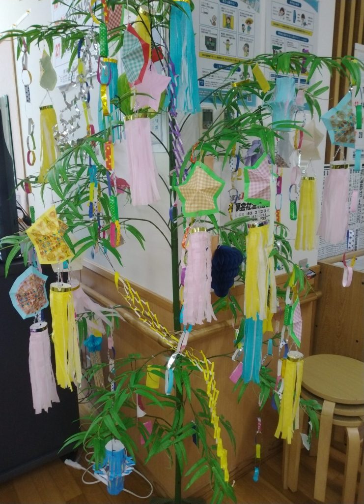 ご利用者様と一緒に笹に飾り付けをしお願い事を書いた短冊を飾りました🤲🌠